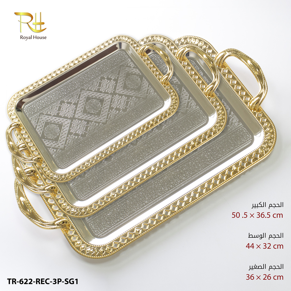 طقم صواني موديل 622 مستطيل ستيل ذهبي فضي 3قطع