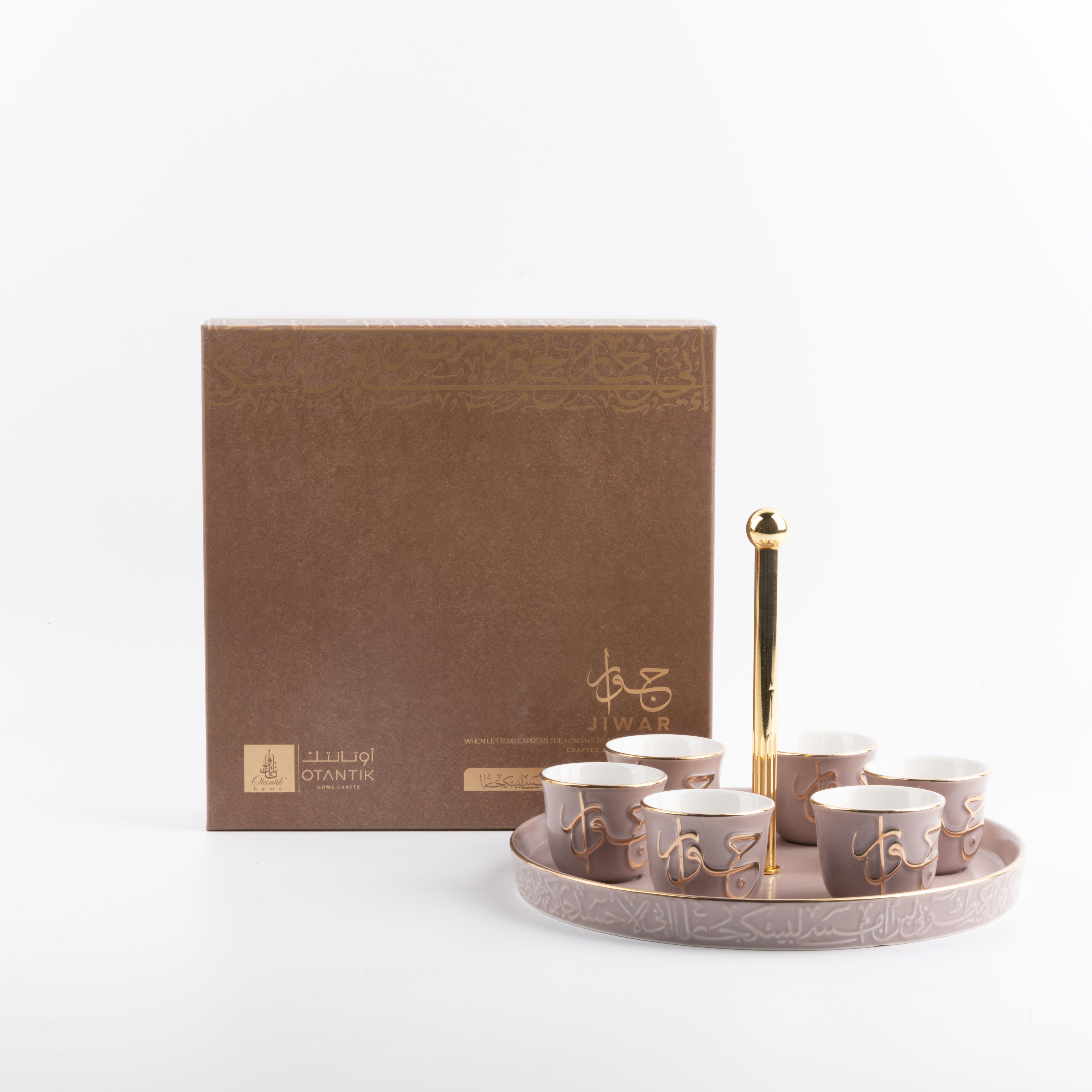 طقم قهوة عربية مع ستاند 7 قطع من جوار - نهدي و ذهبي