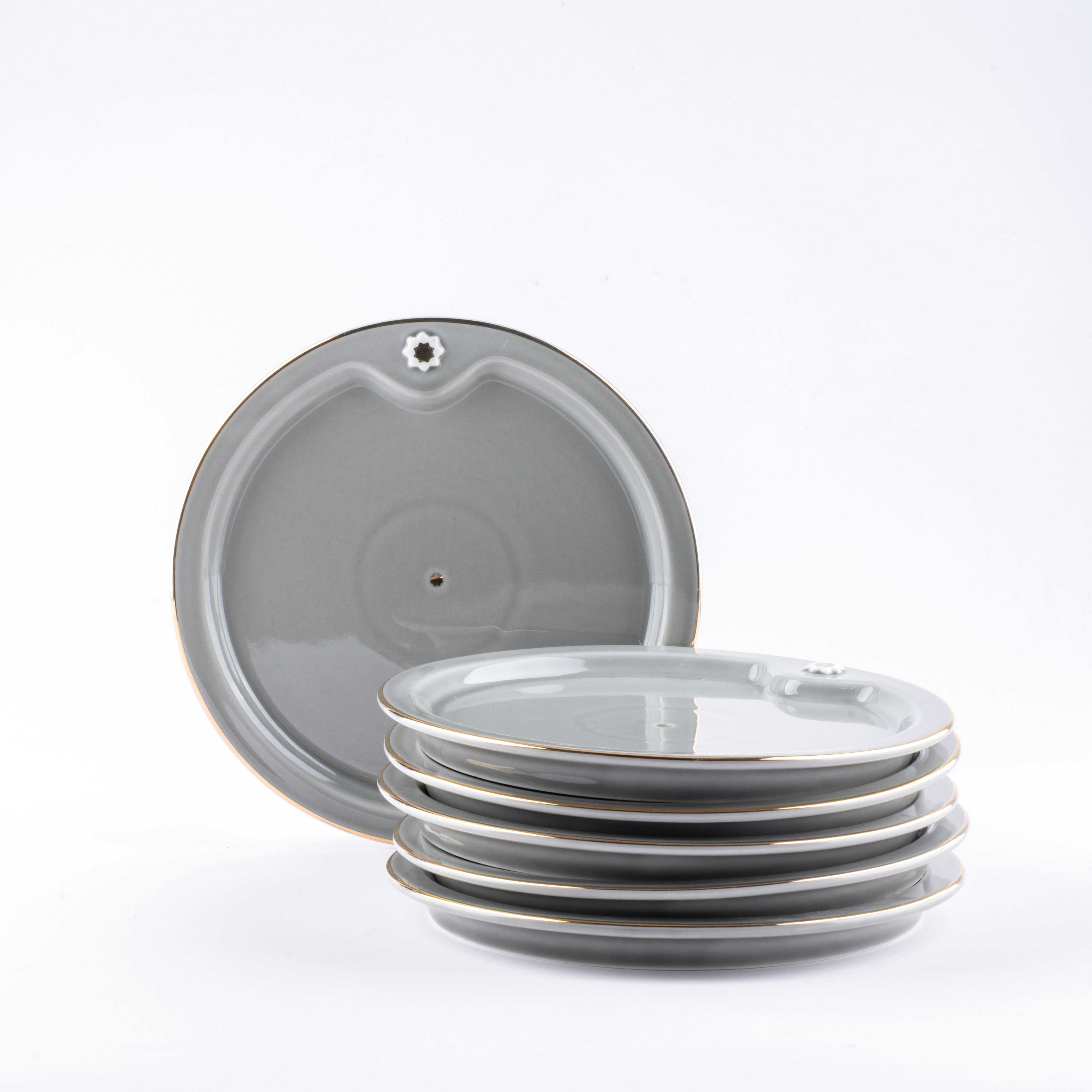 - الأطباق سادة لا تحتوي على نقوشات سوي نجمة بارزة باللون الأبيض في أسود.
