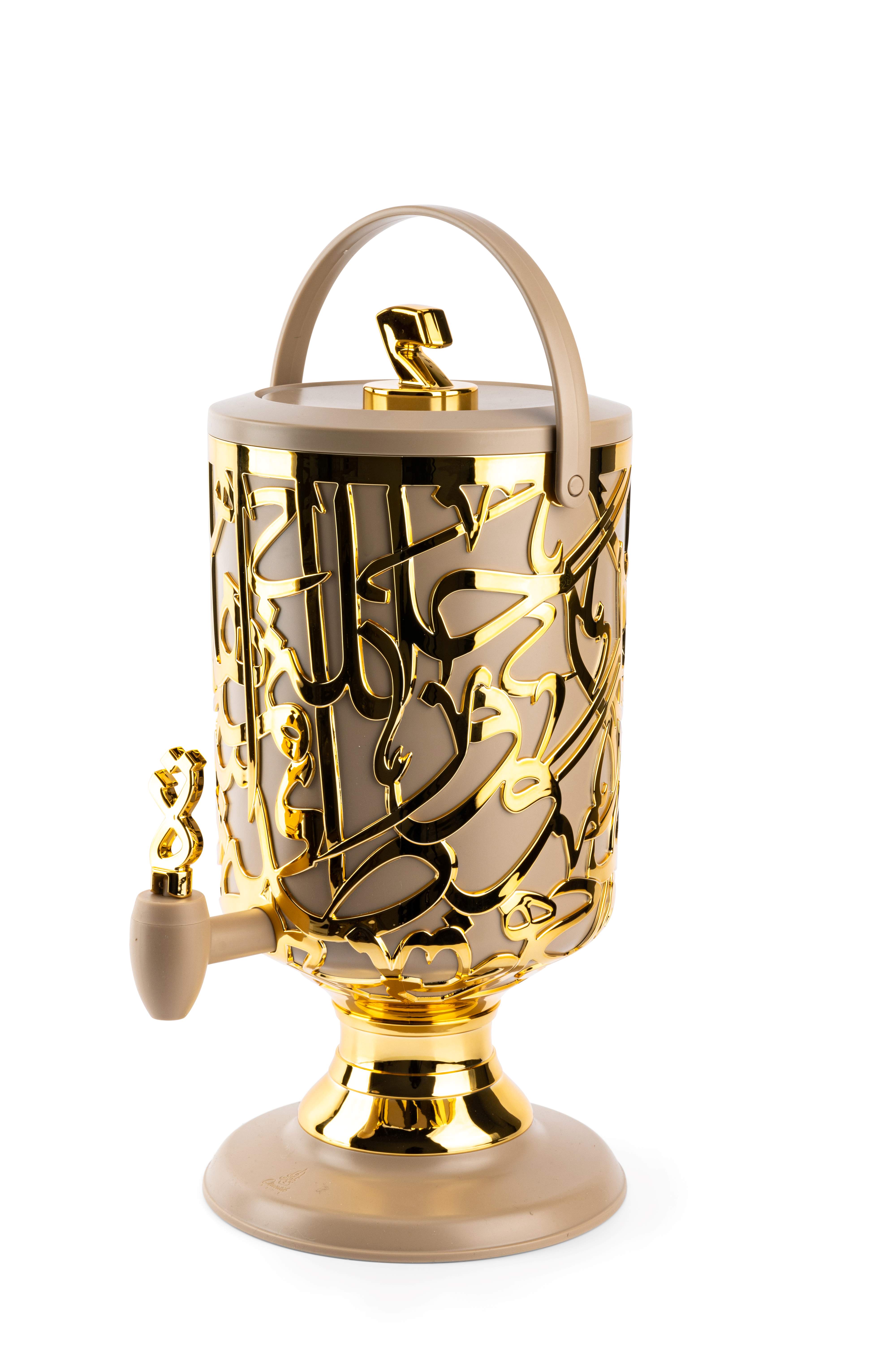 جيك لتقديم العصير تصميمه أنيق لم تراه عينك من قبل جسم الجيك من الخارج مزخرف بالحروف العربية لجملة " حللتم أهلا ووطنتم سهلا"، مزود بحنفية تسهل عملية صب العصير، مما يجعلها تجربة مريحة. تصميمه يتضمن يدًا متينة تسهل حمله وتنقله بين الأماكن بكل يسر. لا تنسى قاعدته الدائرية التي تضيف الاستقرار والثبات.