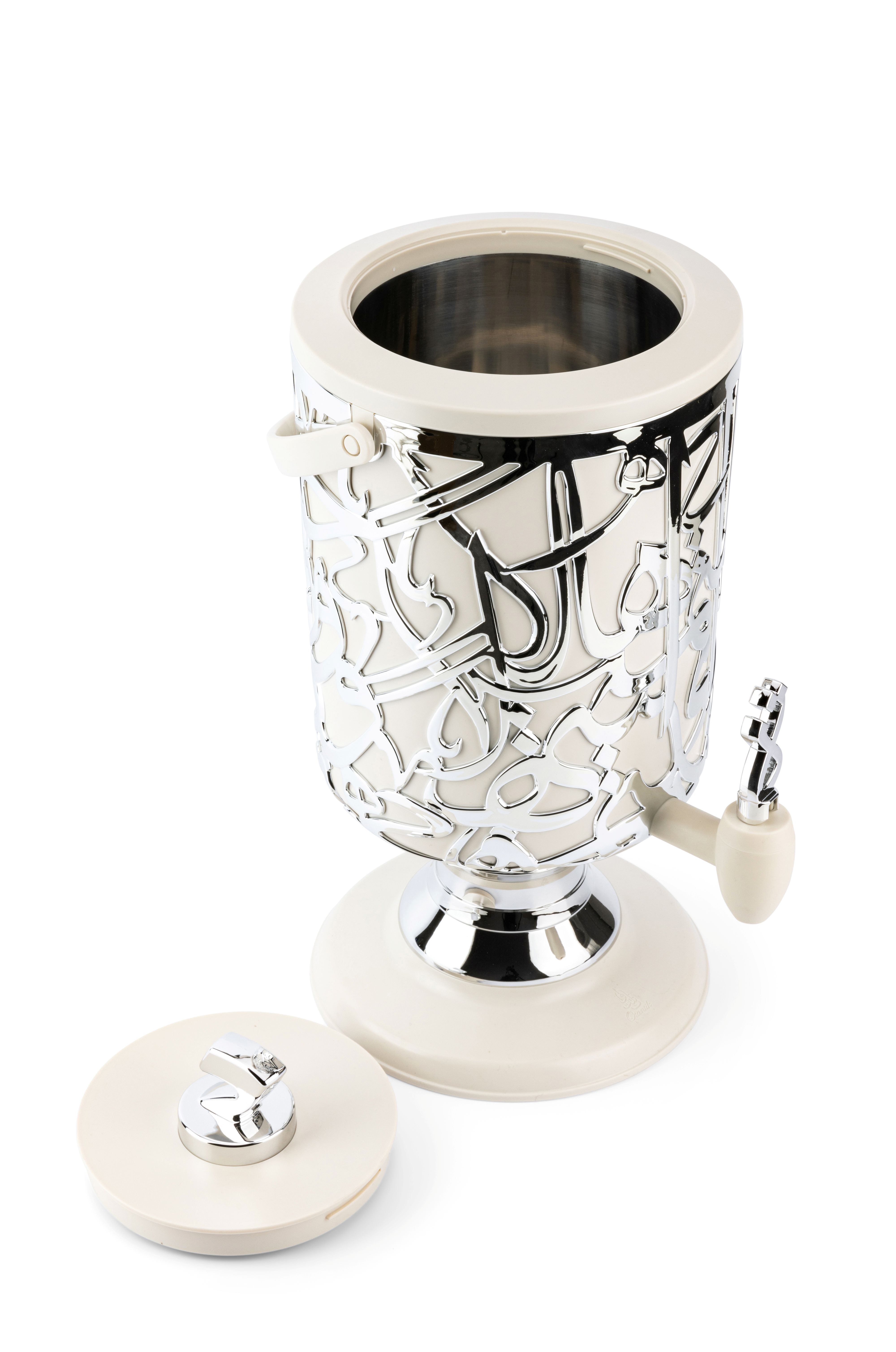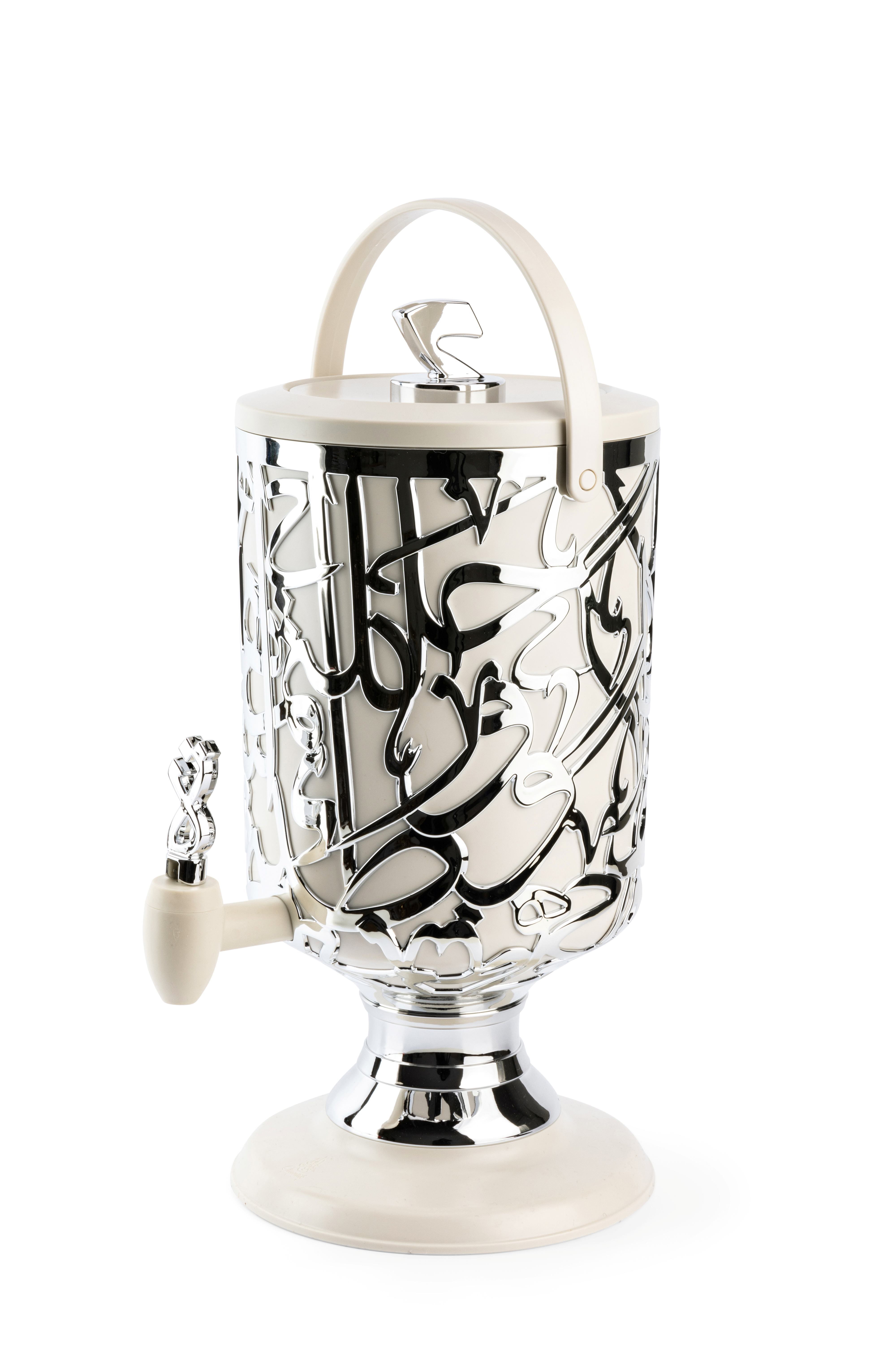 جيك لتقديم العصير تصميمه أنيق لم تراه عينك من قبل جسم الجيك من الخارج مزخرف بالحروف العربية لجملة " حللتم أهلا ووطنتم سهلا"، مزود بحنفية تسهل عملية صب العصير، مما يجعلها تجربة مريحة. تصميمه يتضمن يدًا متينة تسهل حمله وتنقله بين الأماكن بكل يسر. لا تنسى قاعدته الدائرية التي تضيف الاستقرار والثبات.