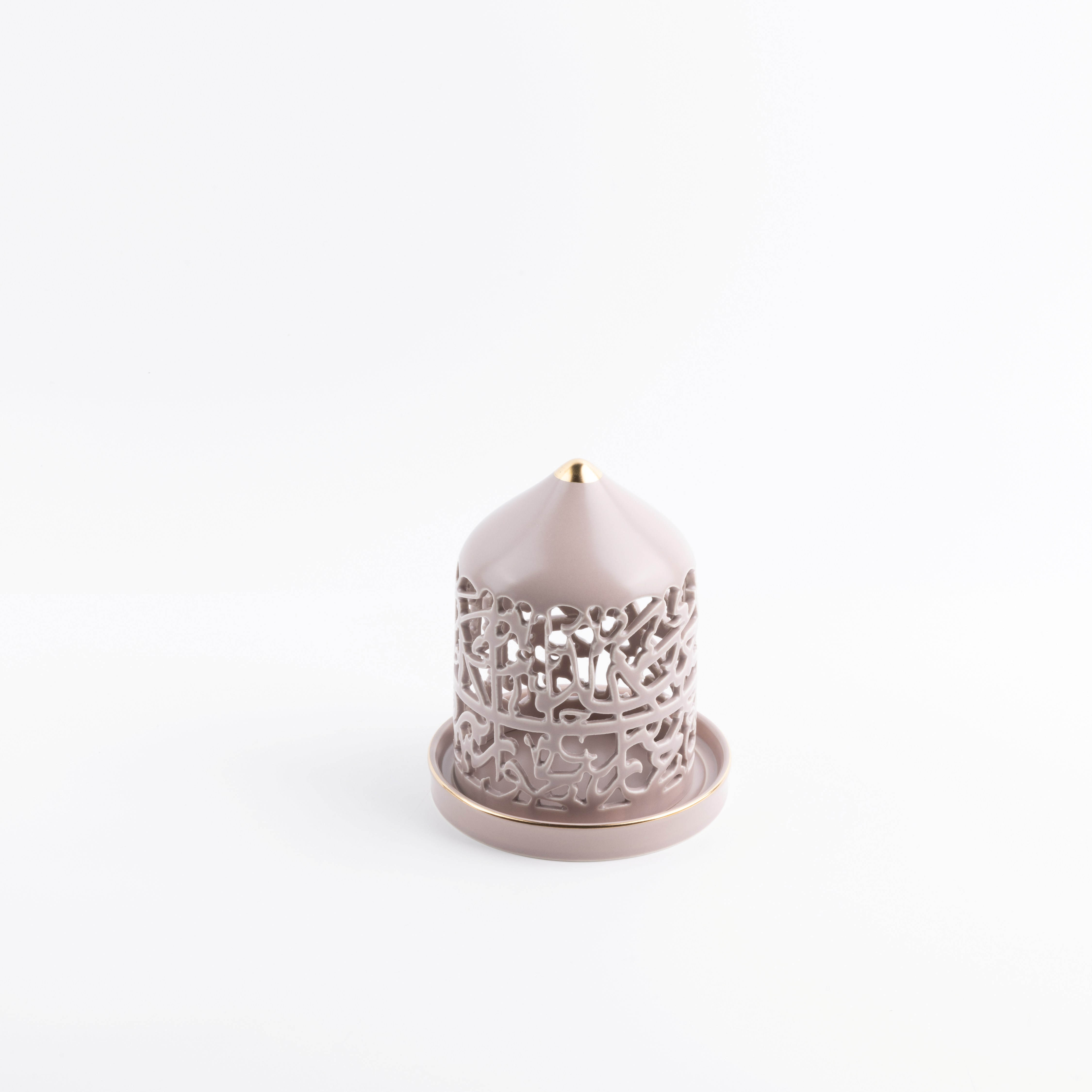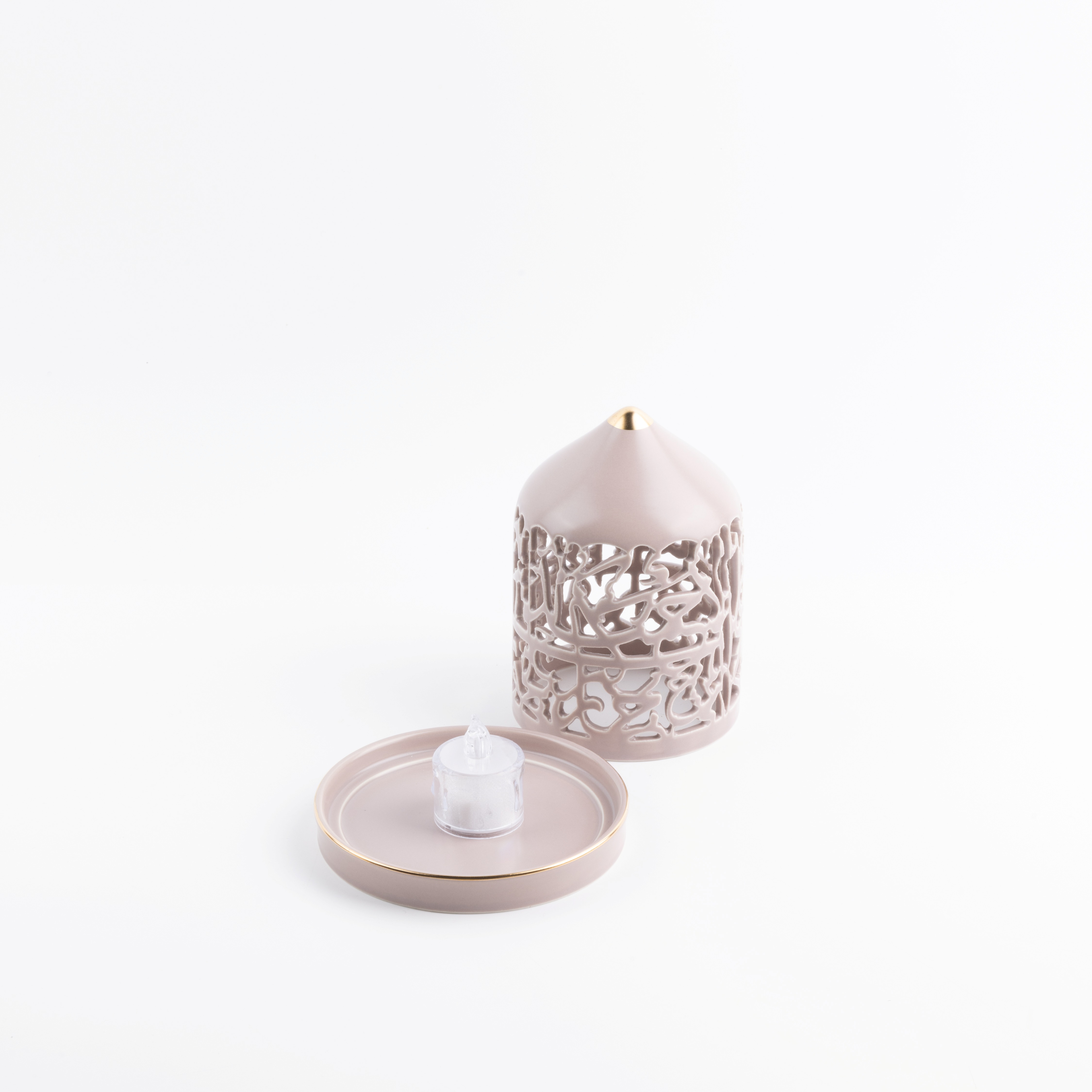 • شمعدان مصنوع من البورسلان مما يمنحه مظهراً راقياً ومتناغماً مع مختلف الديكورات، كما أنه مزين بزخارف مستوحاة من الخط العربي بتفاصيل مفرغة، مما يسمح بانتشار الضوء بشكل جميل عند تشغيله.