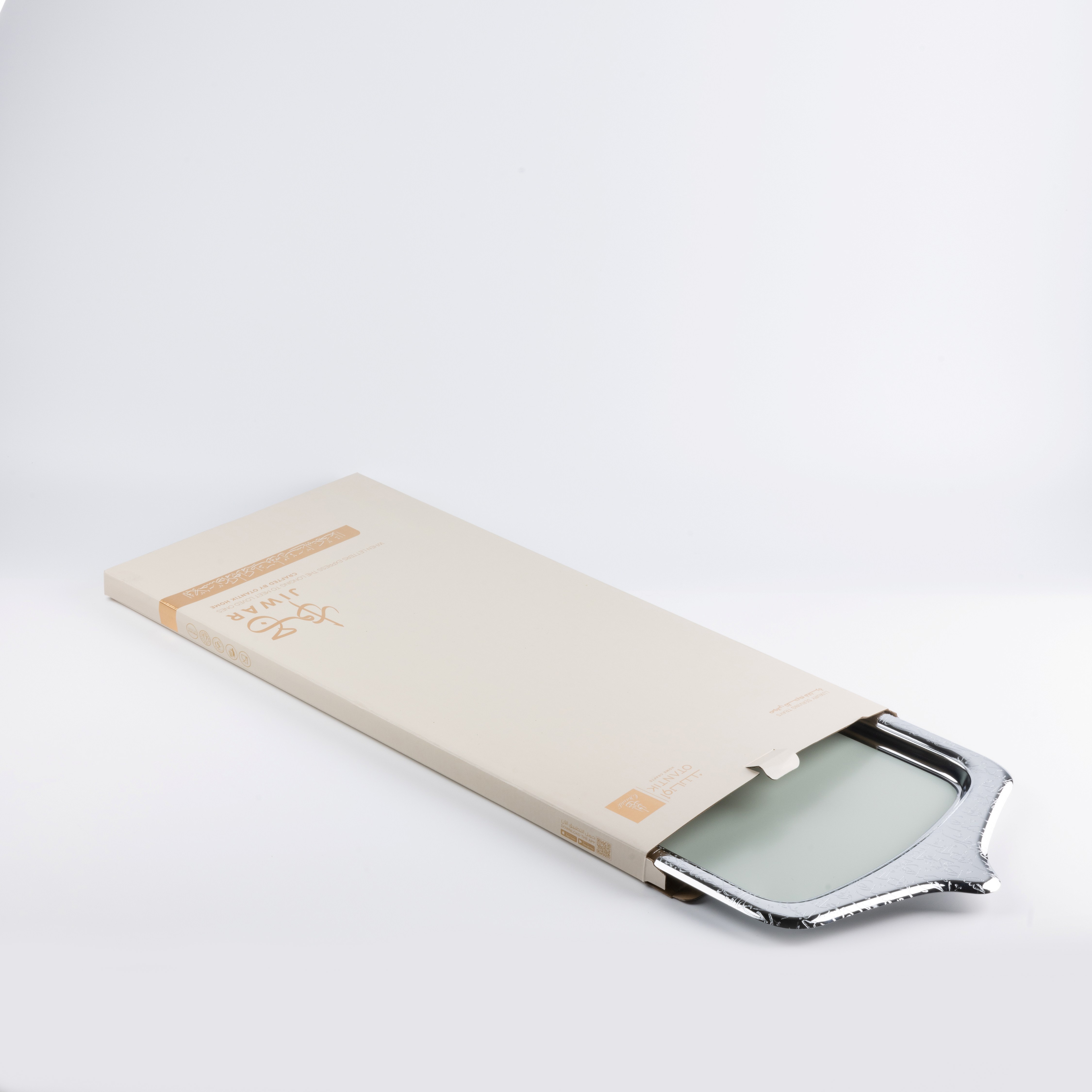 صينية تقديم فاخرة تتميز بتصميم عصري وأنيق يجمع بين الجمال والعملية. تتضمن حواف فضية تضفي لمسة من الفخامة، وأربعة جوانب بتصميم مبتكر يعكس الحداثة والرقي، كما تمتاز بمقبضين بارزين إلى الخارج عمليين لتسهيل حملها وتقديم الضيافة بأناقة مميزة.