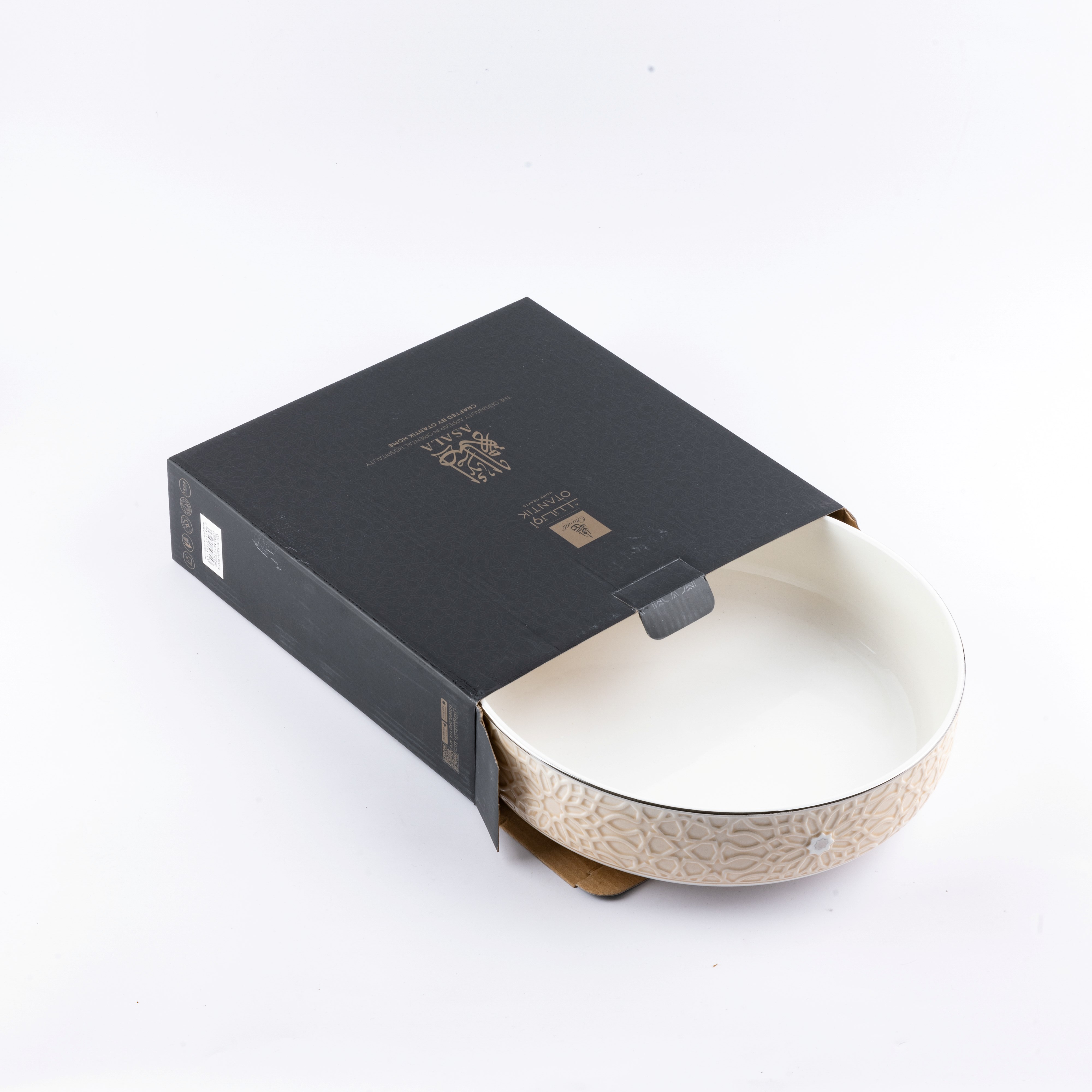 وعاء تقديم السلطة يتميز بتصميمه الفاخر المستوحى من الزخارف العربية التقليدية، مما يضفي عليه طابعًا تراثيًا أنيقًا، مصنوع من البورسلان عالي الجودة، يأتي بلمسة نهائية متقنة تتناسب مع مختلف أنماط المائدة، الحواف الجانبية مزينة بزخارف بارزة تتداخل بتناسق لتمنح الوعاء لمسة فنية تضيف جمالاً وأناقة إلى كل وجبة يتم تقديمها.