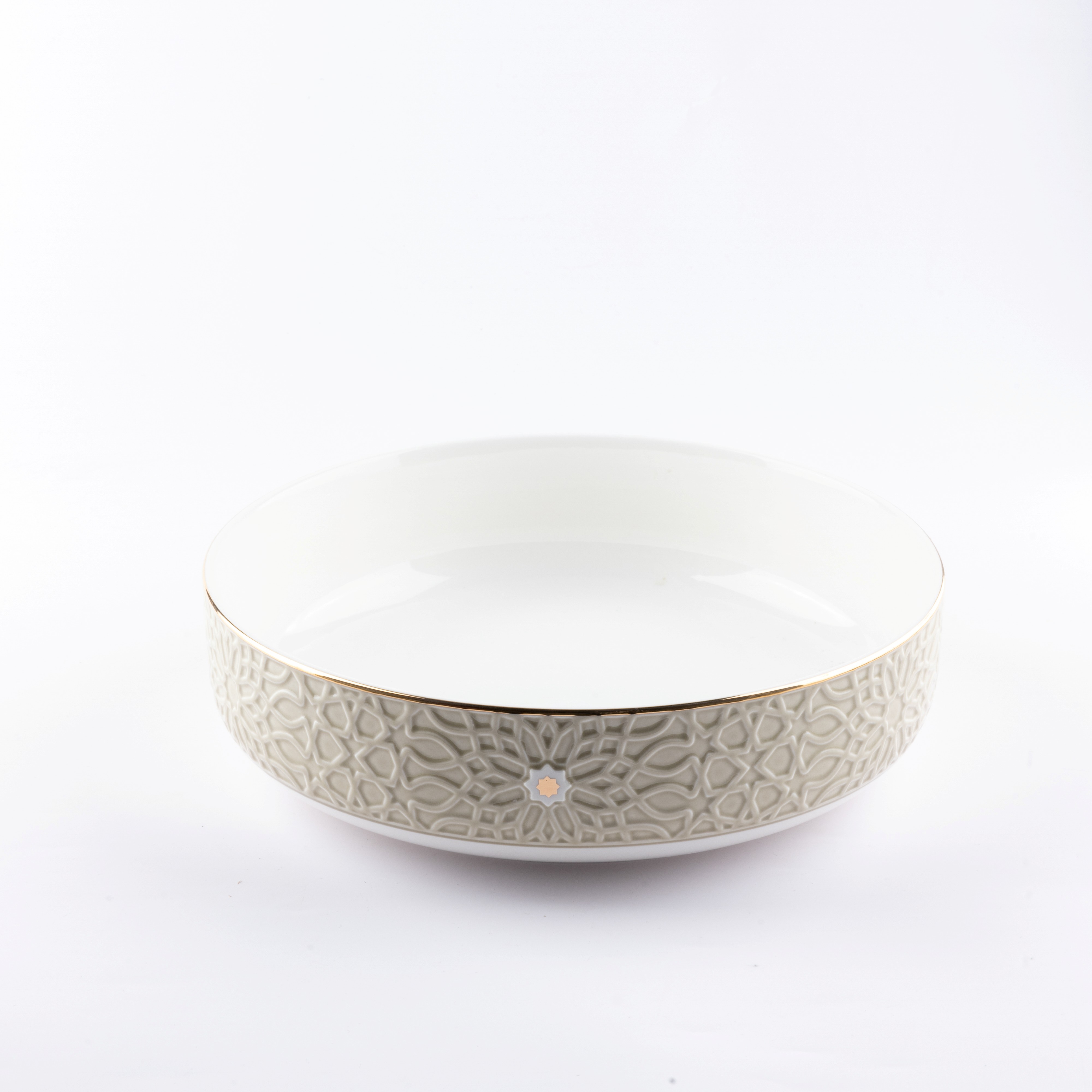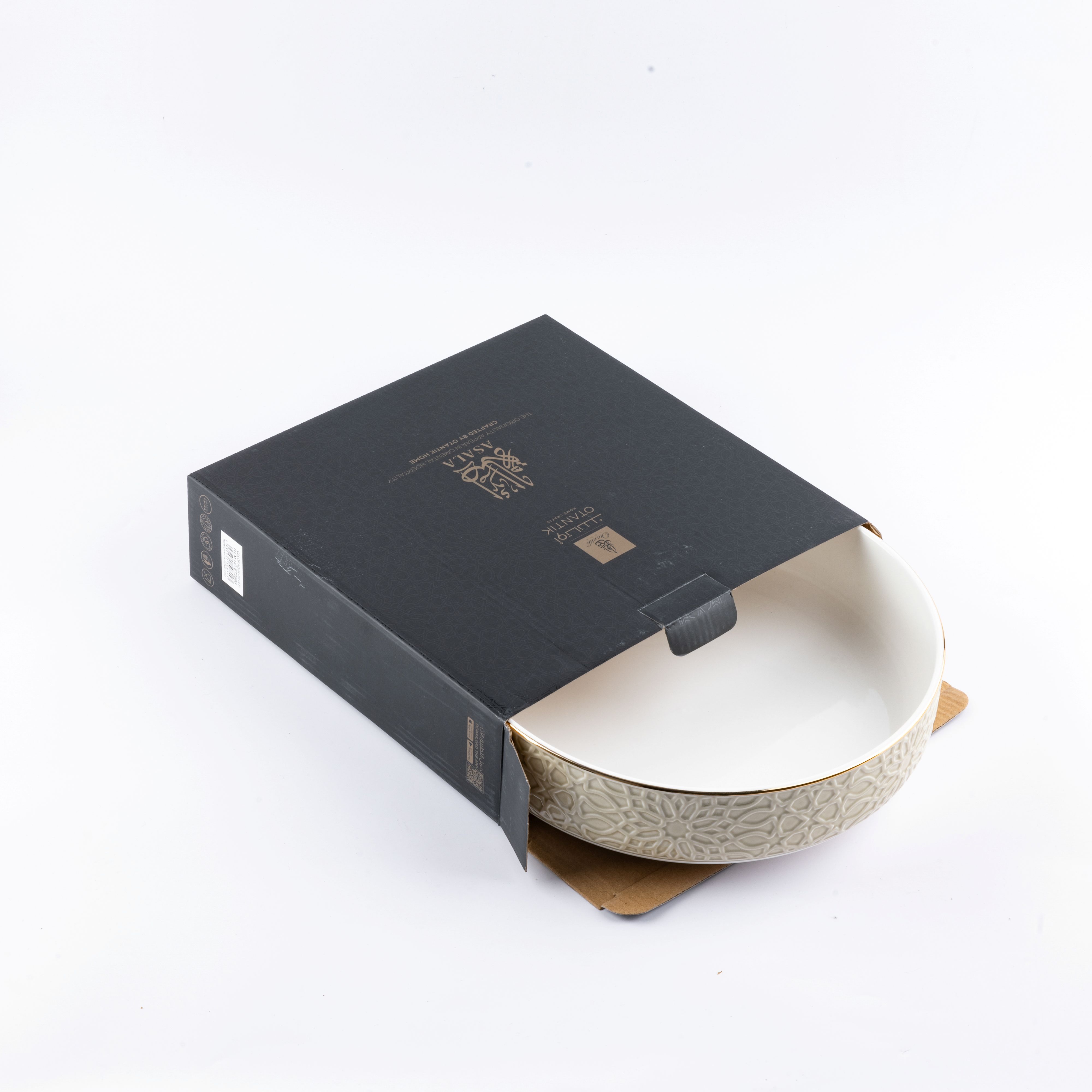 وعاء تقديم السلطة يتميز بتصميمه الفاخر المستوحى من الزخارف العربية التقليدية، مما يضفي عليه طابعًا تراثيًا أنيقًا، مصنوع من البورسلان عالي الجودة، يأتي بلمسة نهائية متقنة تتناسب مع مختلف أنماط المائدة، الحواف الجانبية مزينة بزخارف بارزة تتداخل بتناسق لتمنح الوعاء لمسة فنية تضيف جمالاً وأناقة إلى كل وجبة يتم تقديمها.