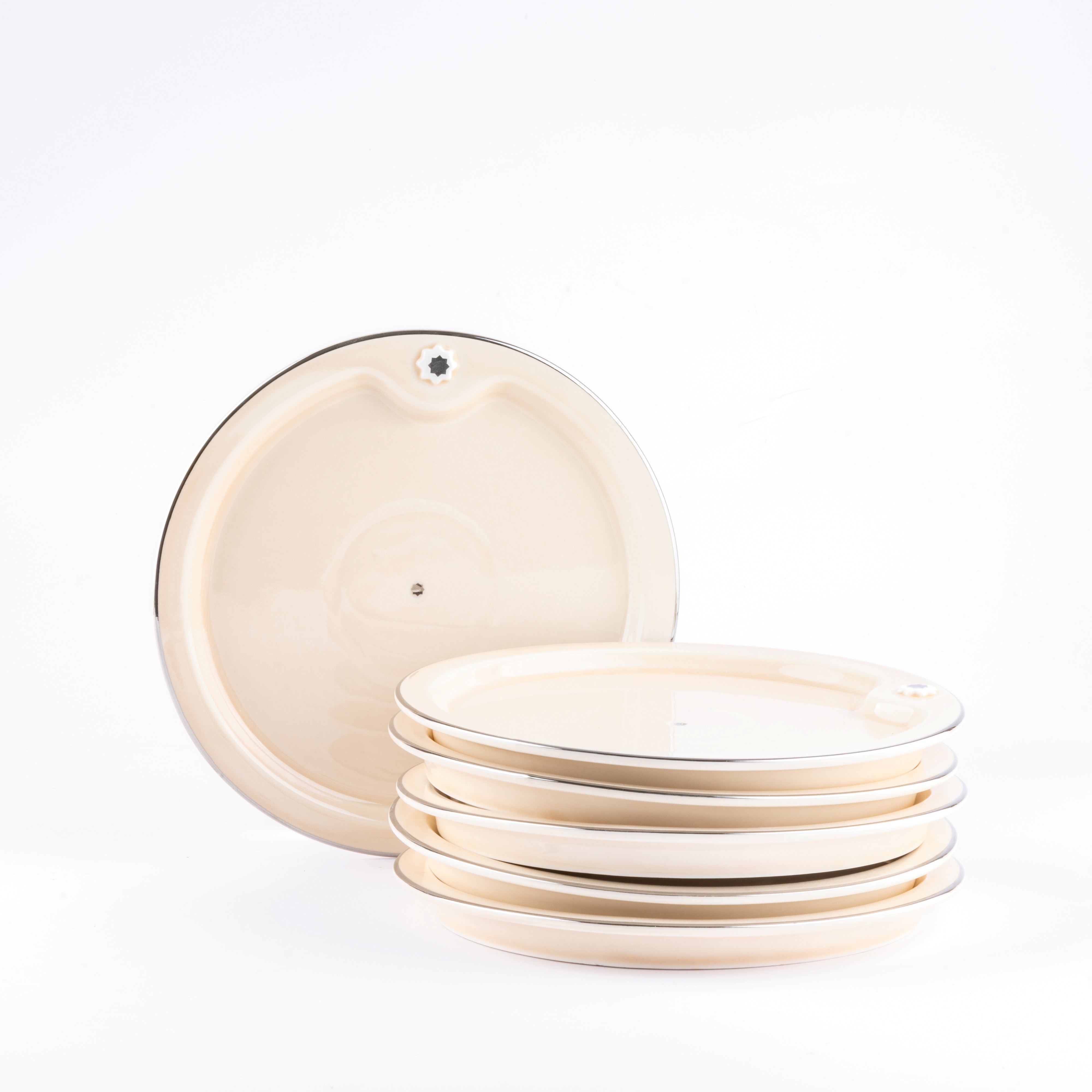 - Each plate is adorned with a golden line along its edges.
