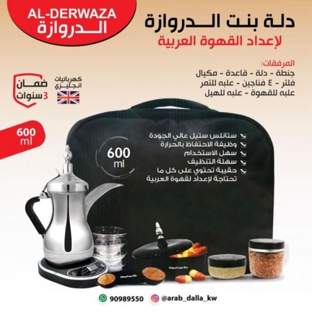Dallah Bint Al Darwaza Electric 600 ml is the ideal choice for Arabic coffee lovers. It features a stylish design and high-quality materials, ensuring excellent durability and performance. It allows you to prepare coffee easily and quickly thanks to the advanced electric heating system. It is your ideal companion in traditional hospitality sessions and adds a modern touch to the coffee serving experience.