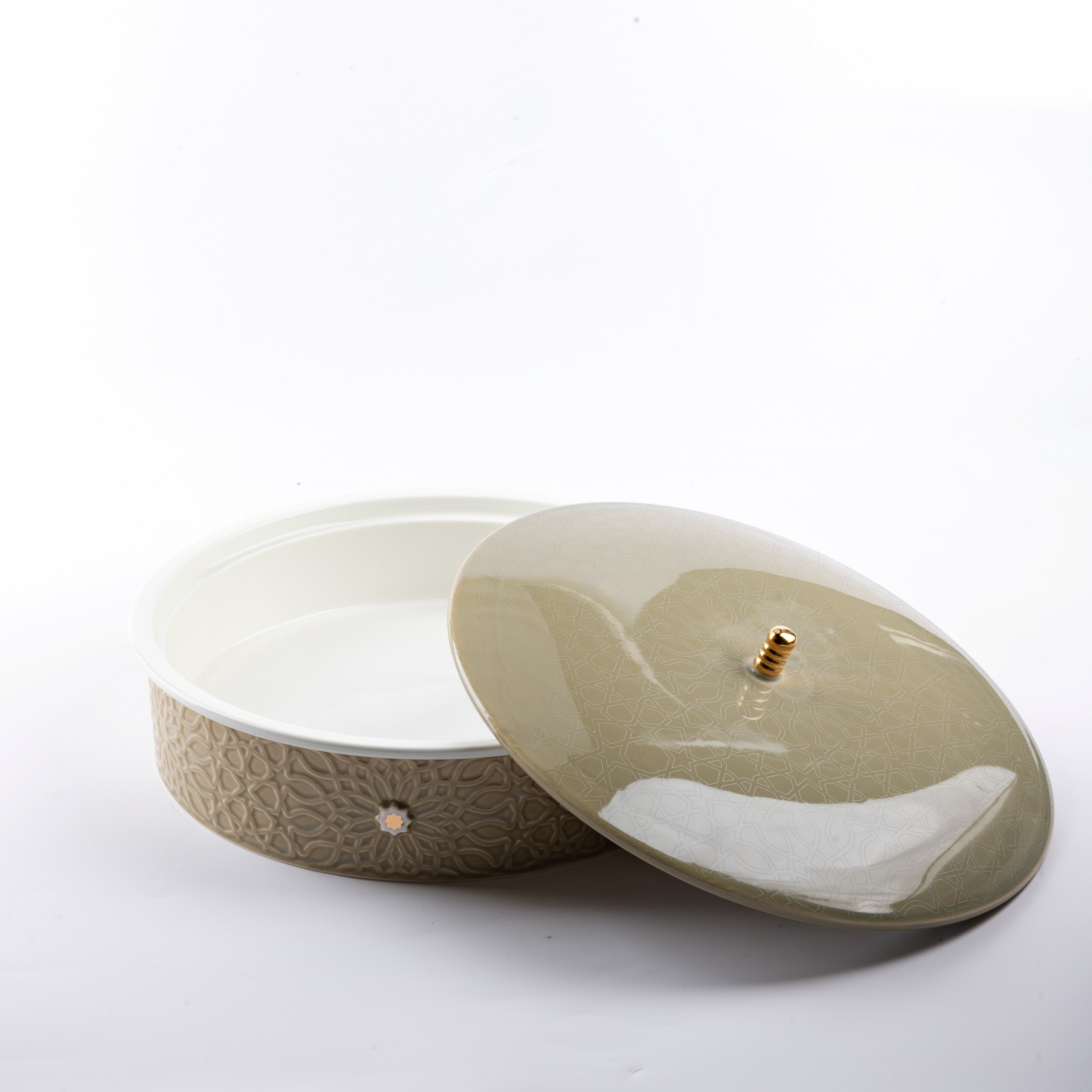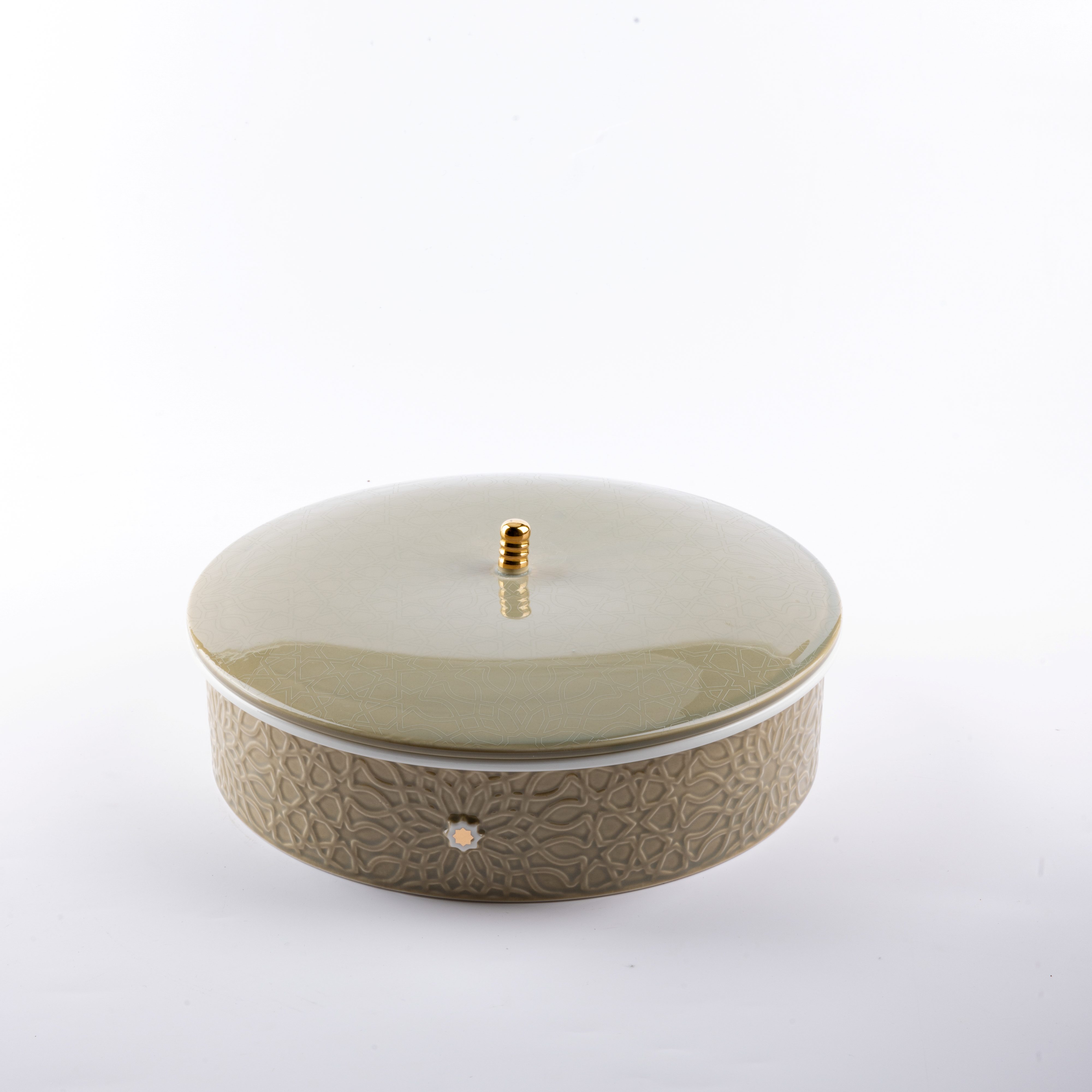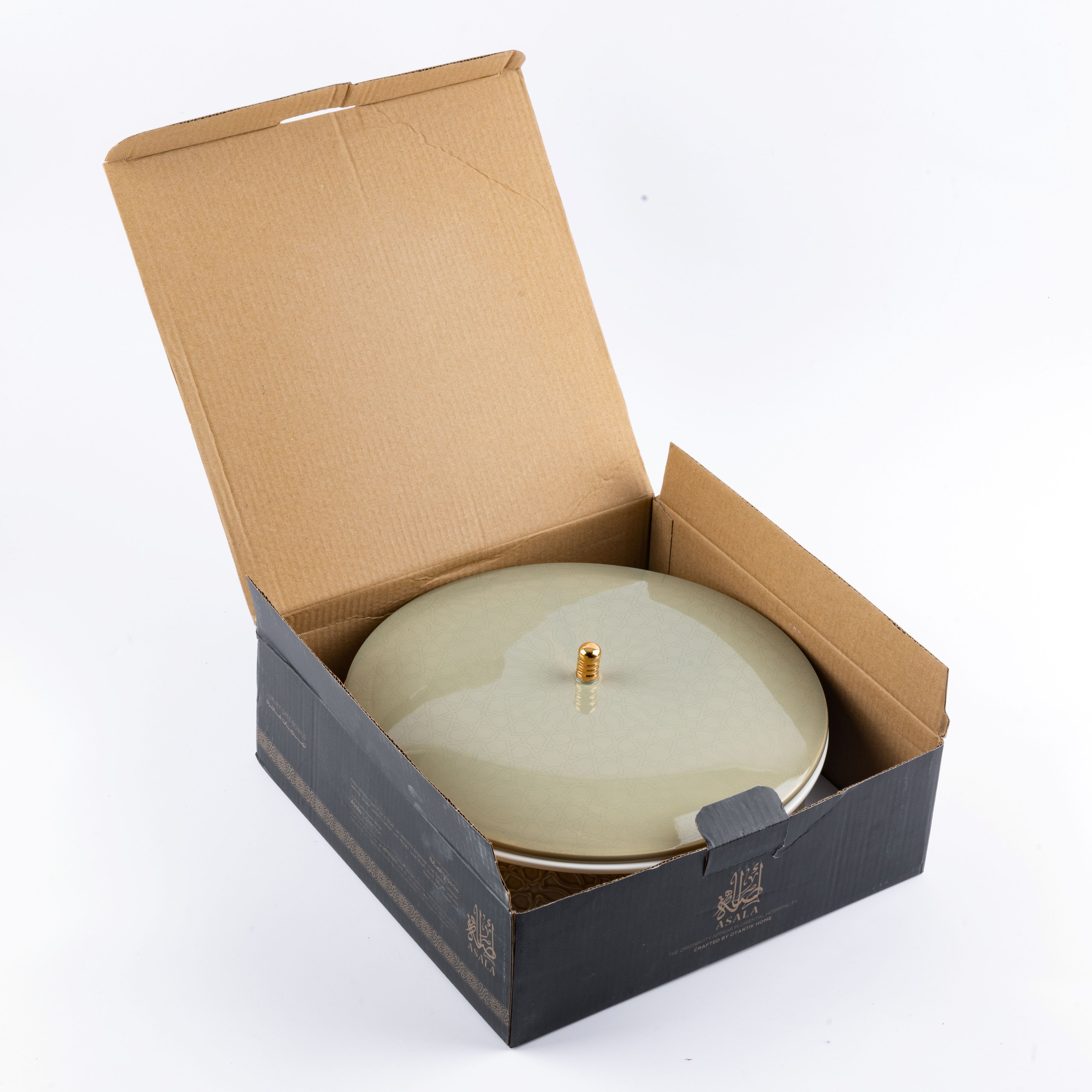 - Protective Lid: Designed to shield dates from dust or contaminants, featuring a convenient size and harmonious design. The lid includes a golden handle for easy lifting, adding a relaxed and luxurious element to the date-serving experience. Its elegant yet practical design makes serving dates effortless and comfortable.