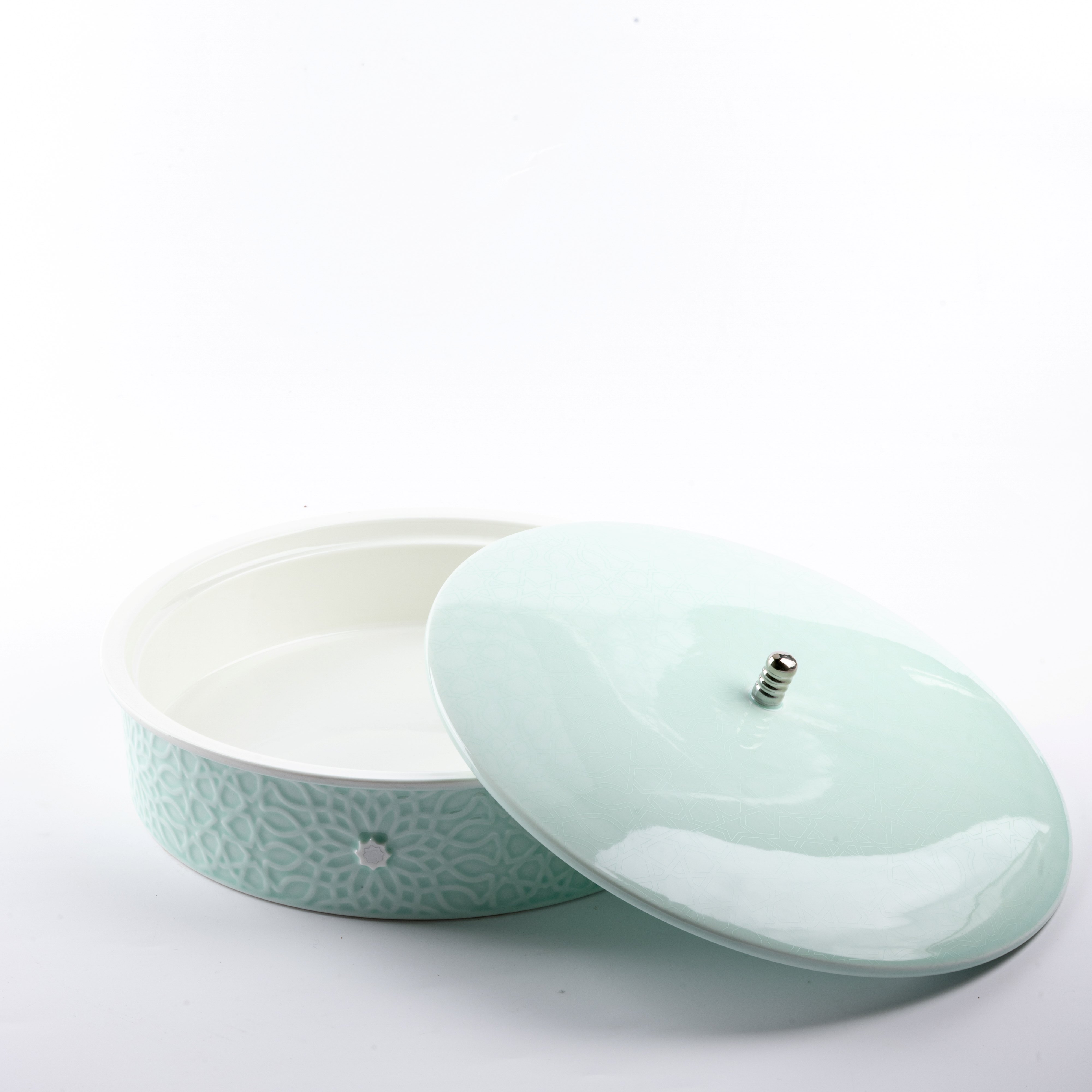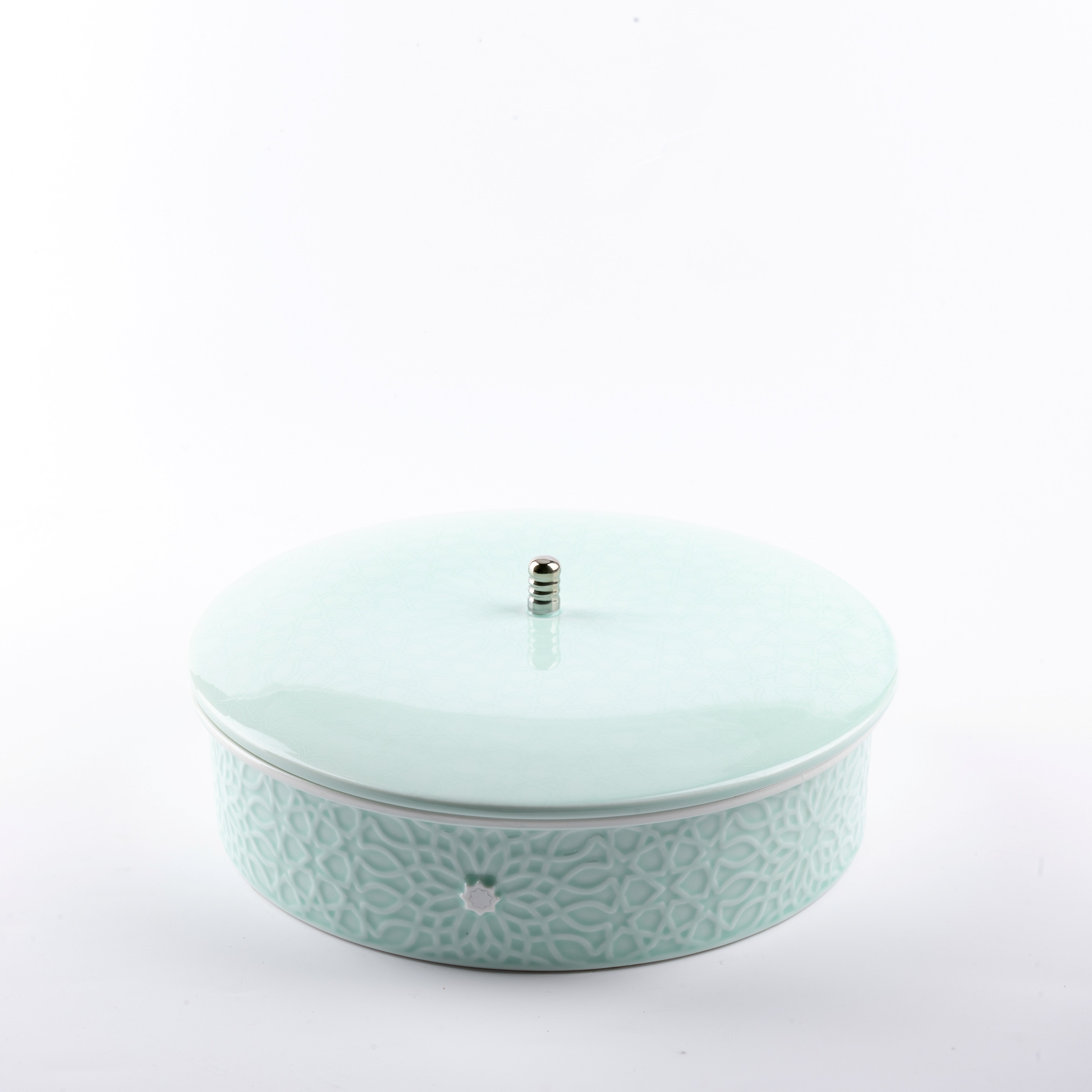 • Protective Lid: Designed to shield dates from dust or contaminants, featuring a convenient size and harmonious design. The lid includes a golden handle for easy lifting, adding a relaxed and luxurious element to the date-serving experience. Its elegant yet practical design makes serving dates effortless and comfortable.