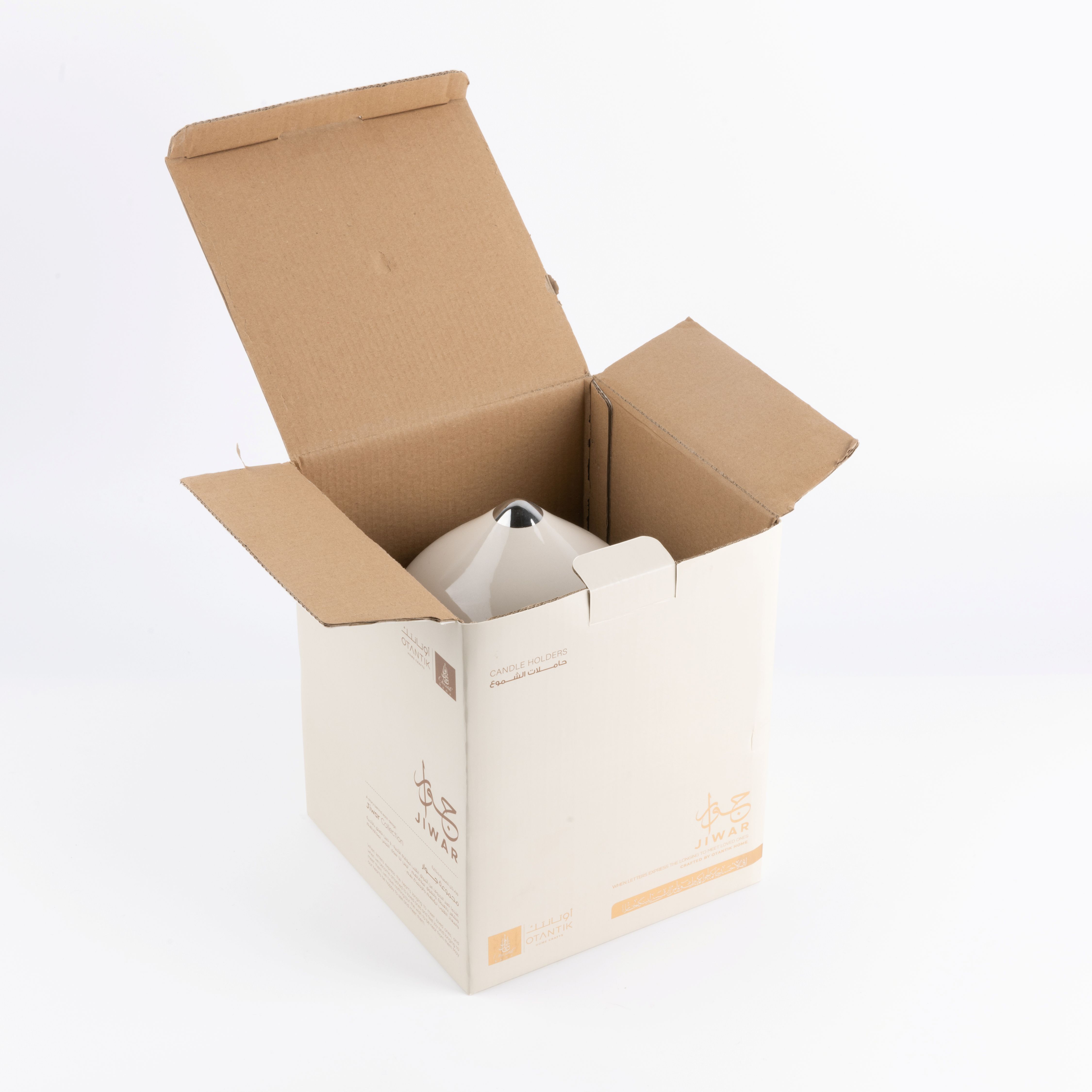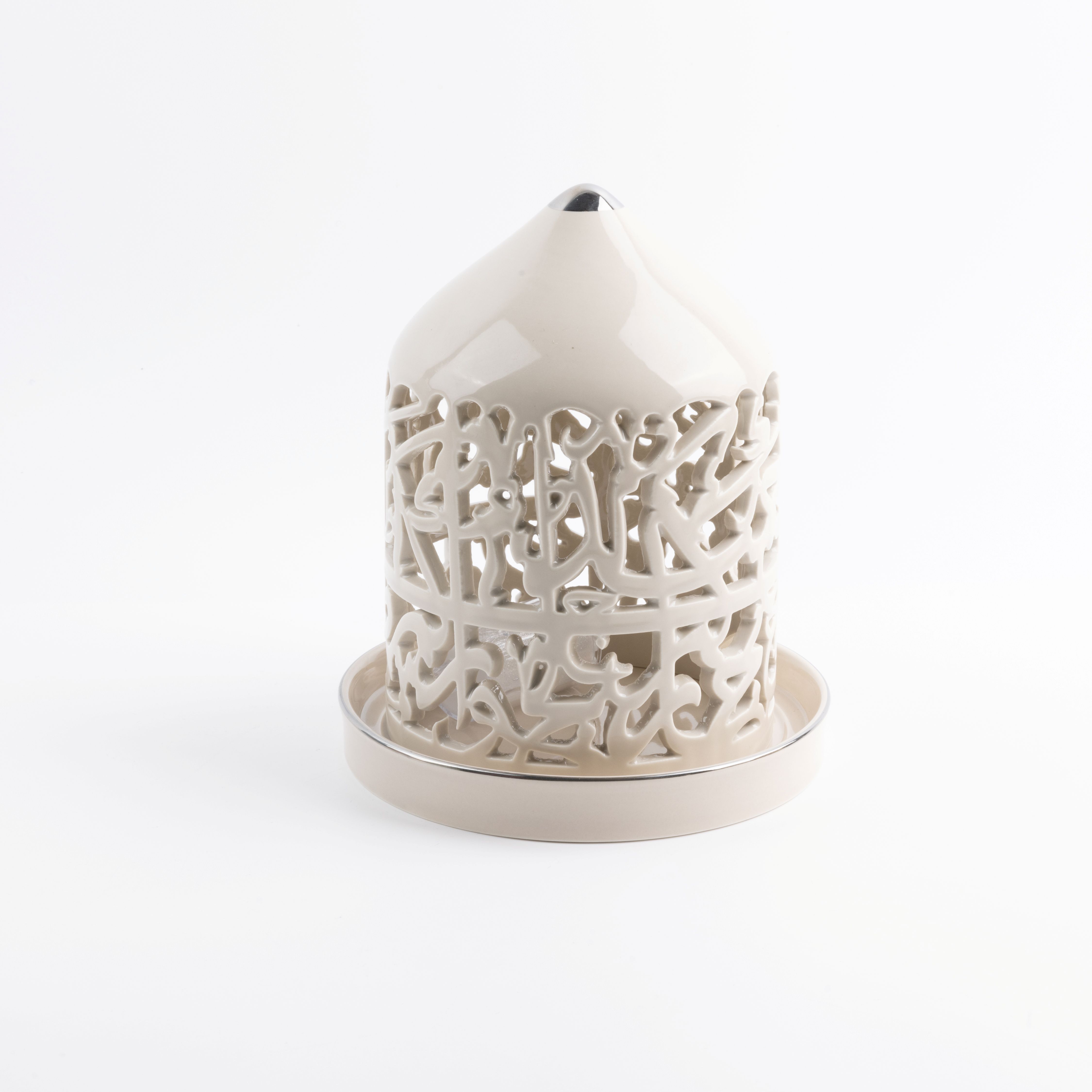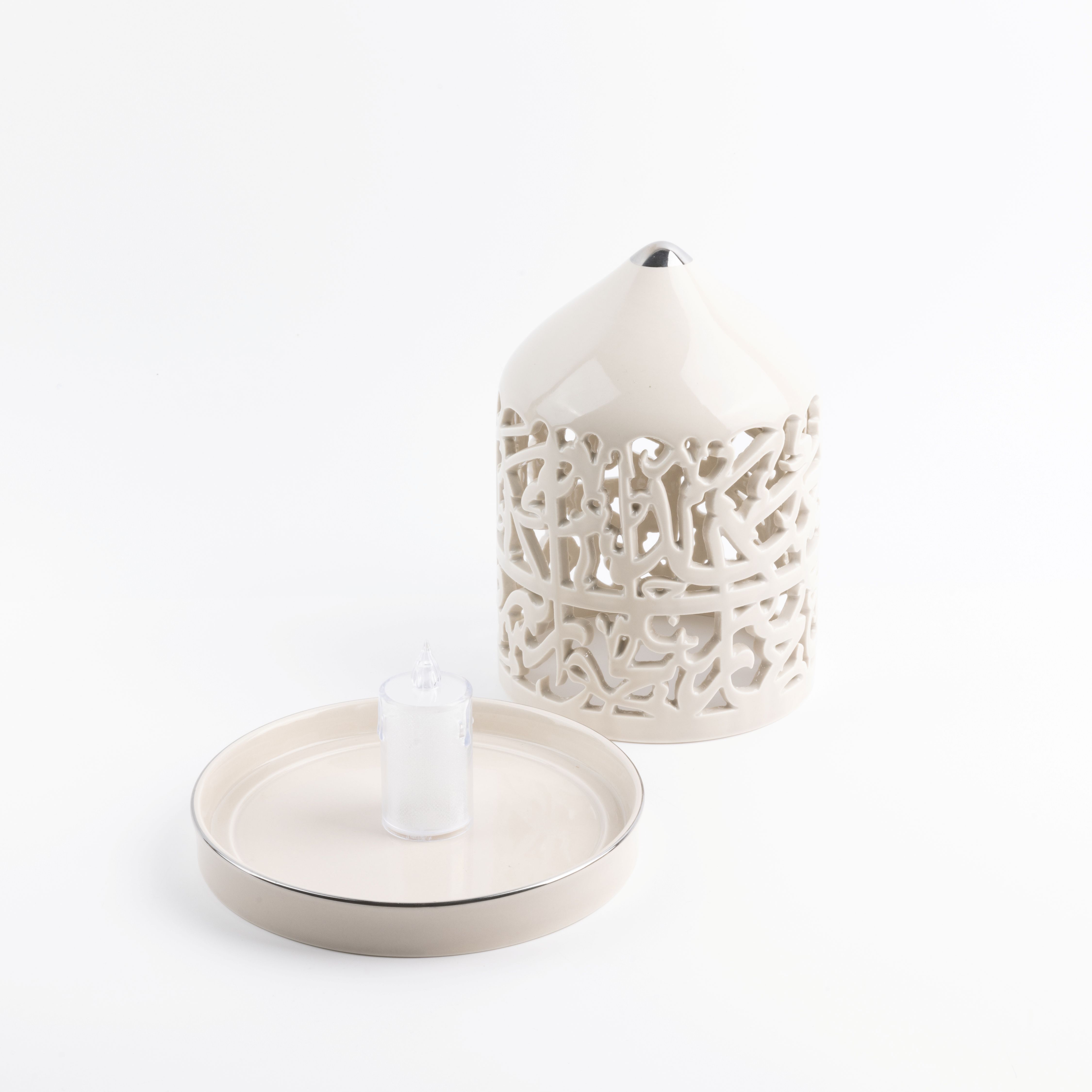 - The candle holder is made from porcelain, giving it an elegant appearance that harmonizes with various decors. It is decorated with Arabic calligraphy-inspired engravings with intricate details, allowing the light to spread beautifully when turned on. It comes with an elegant circular base that adds stability and protects surfaces from heat.