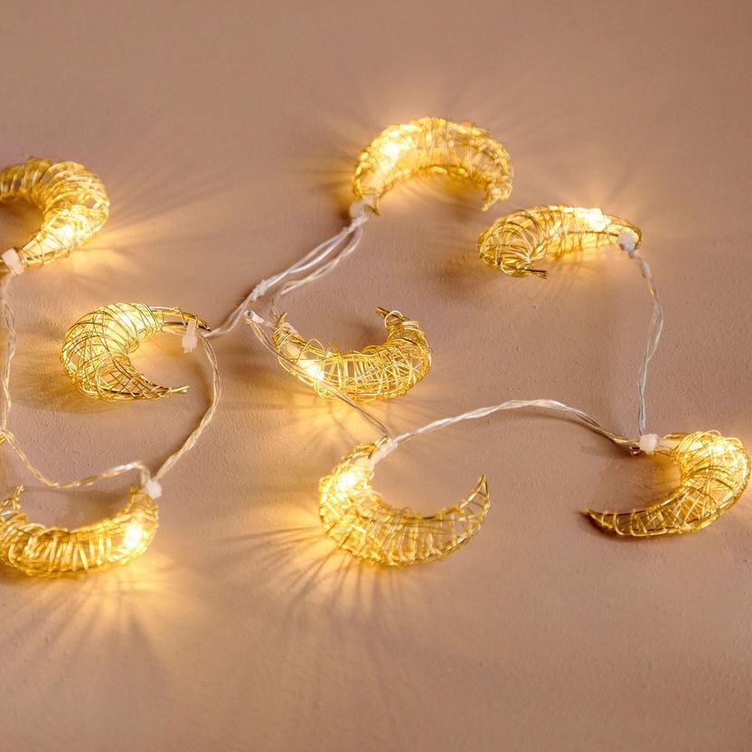 A 120 cm long lighting rope featuring ten luminous crescents, ideal for creating a magical atmosphere on various occasions such as Ramadan and holidays. It is battery operated, allowing ease of use and installation without the need for a direct electrical source. Its elegant and versatile design is suitable for decorating rooms and balconies, adding a unique aesthetic touch that reflects the spirit of the occasion