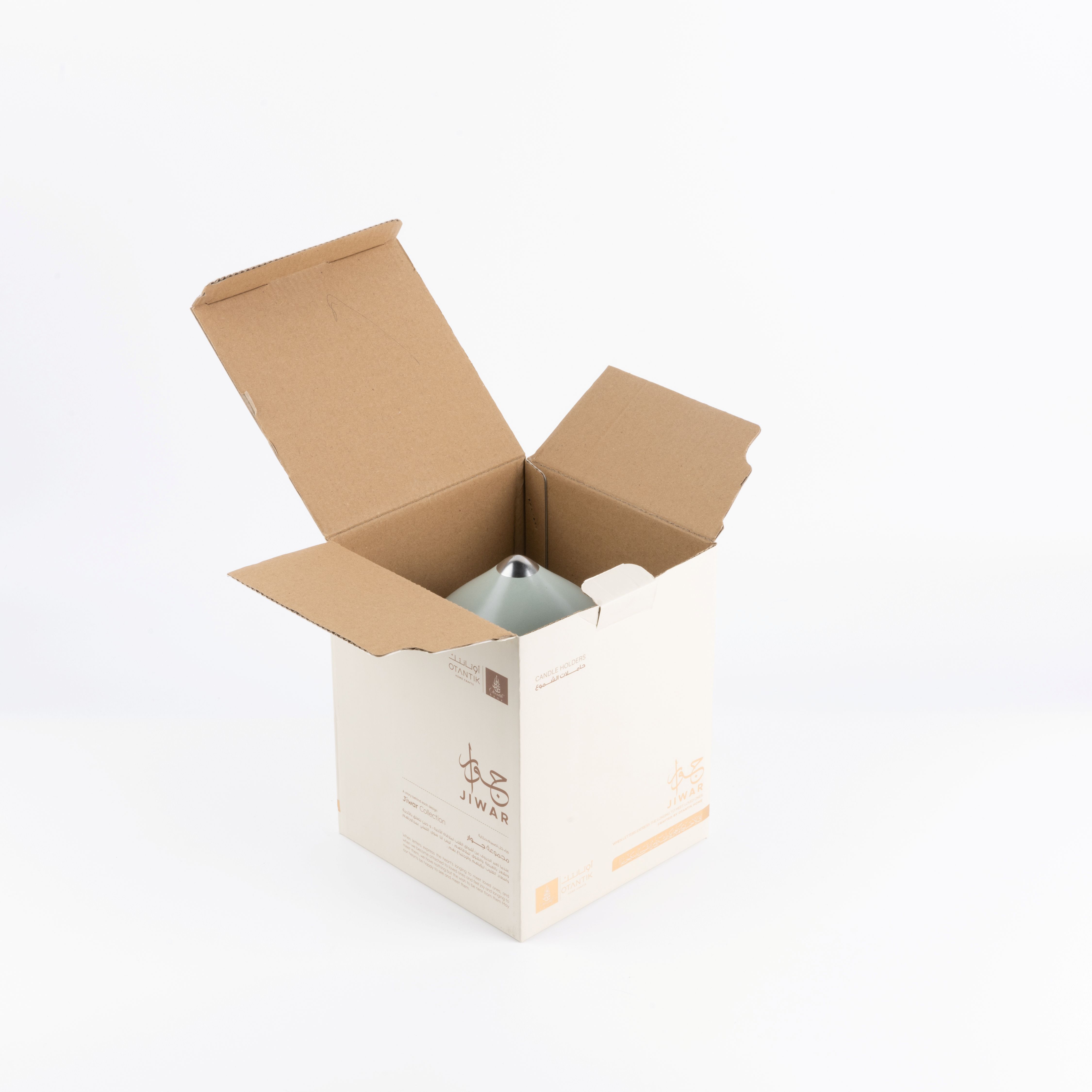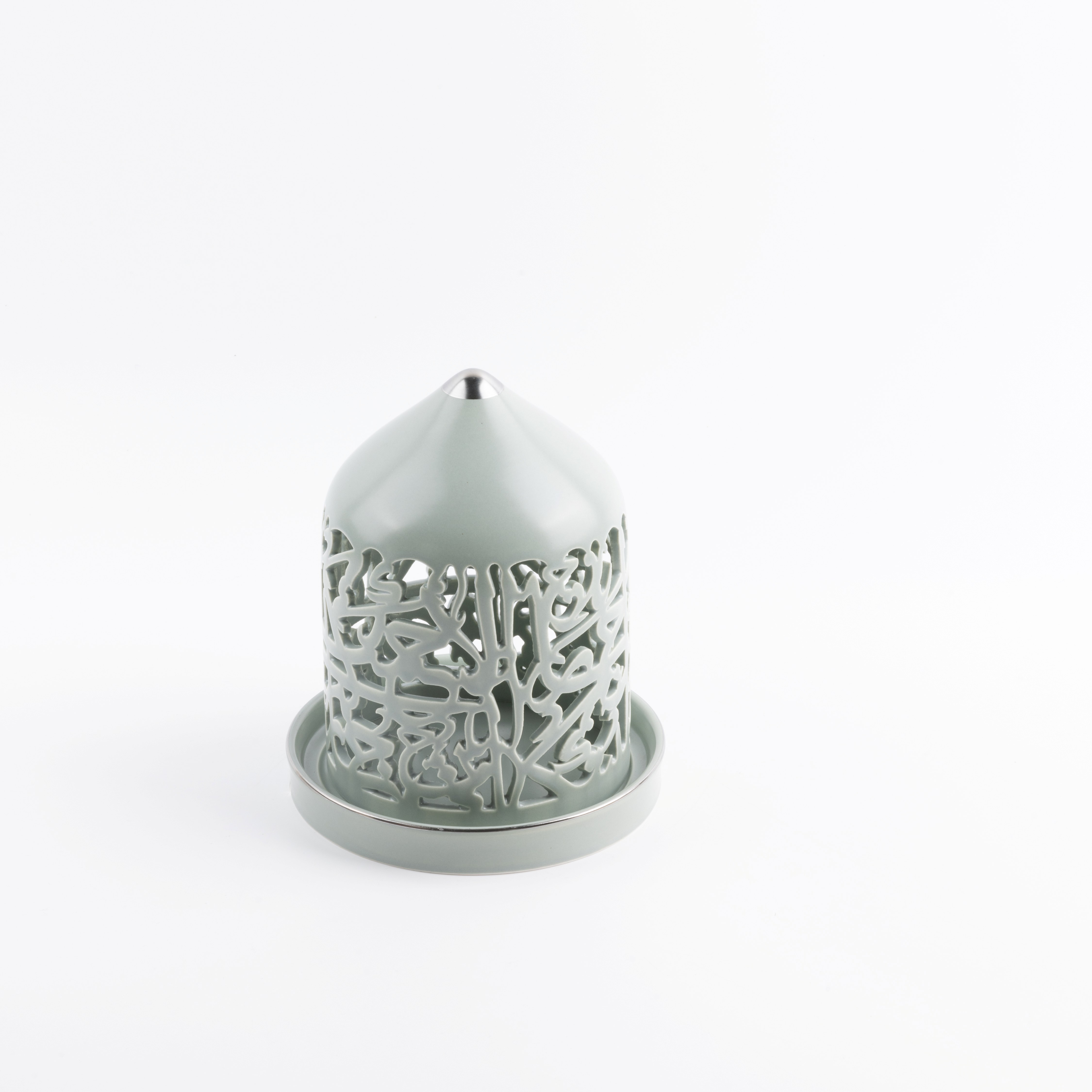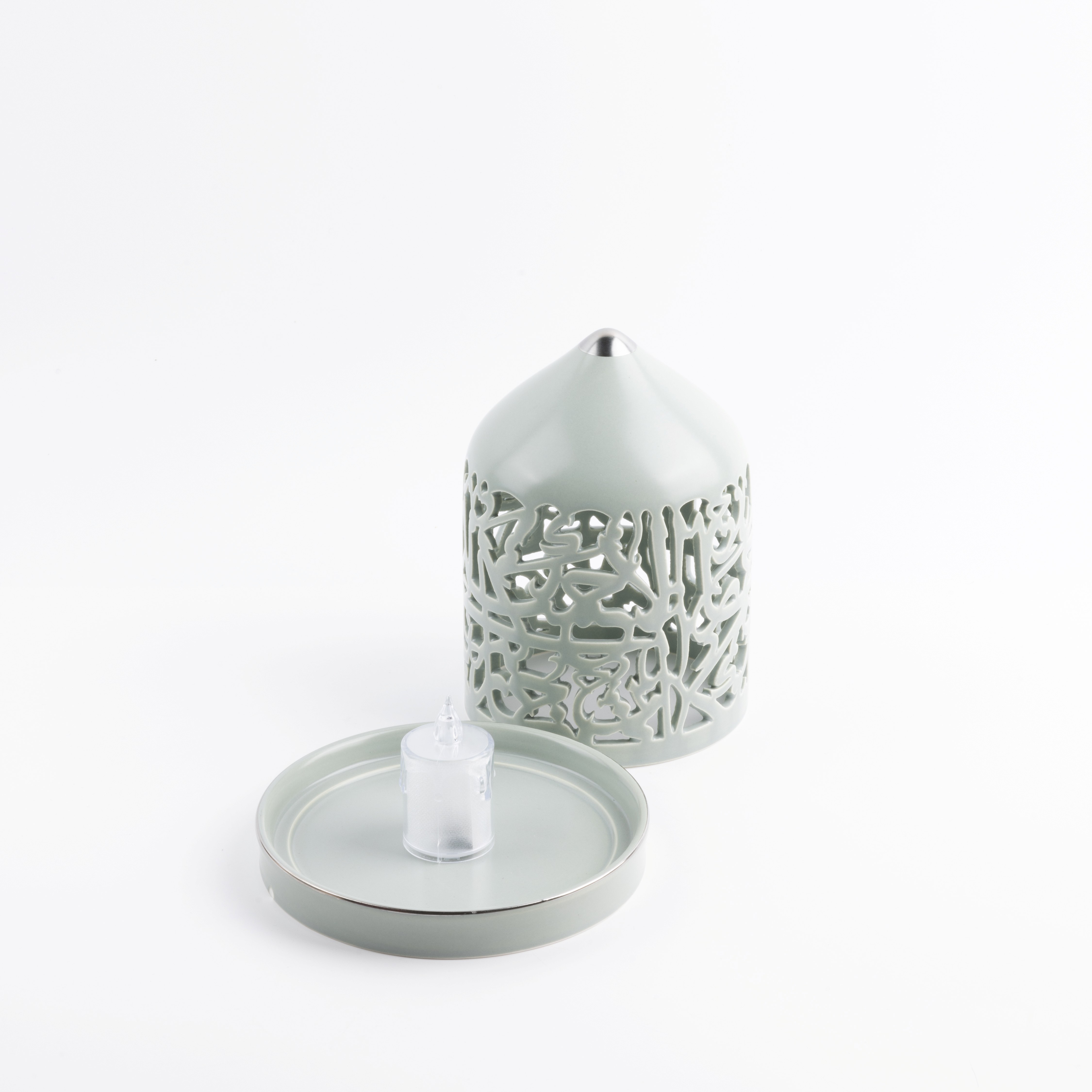 - The candle holder is made from porcelain, giving it an elegant appearance that harmonizes with various decors. It is decorated with Arabic calligraphy-inspired engravings with intricate details, allowing the light to spread beautifully when turned on. It comes with an elegant circular base that adds stability and protects surfaces from heat.