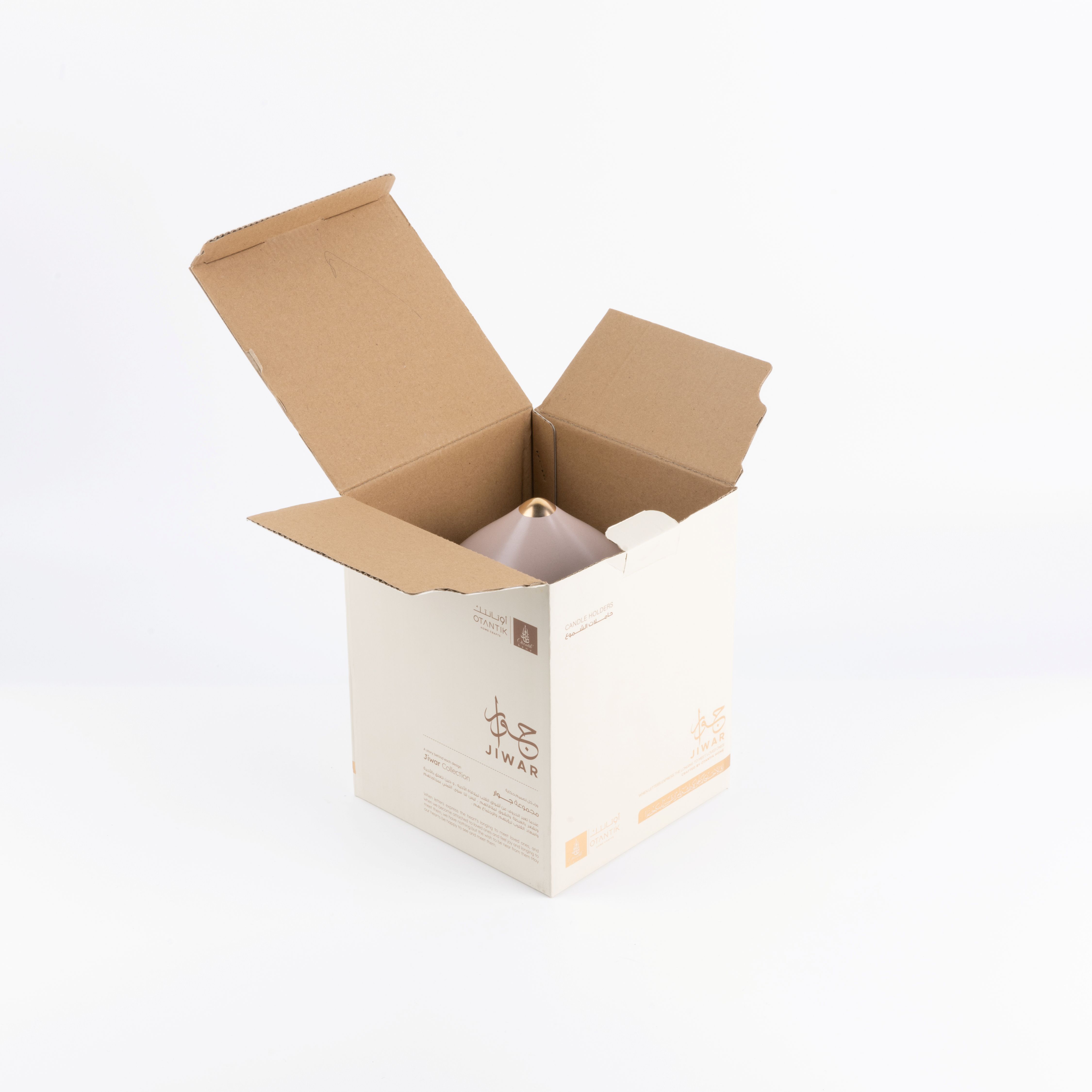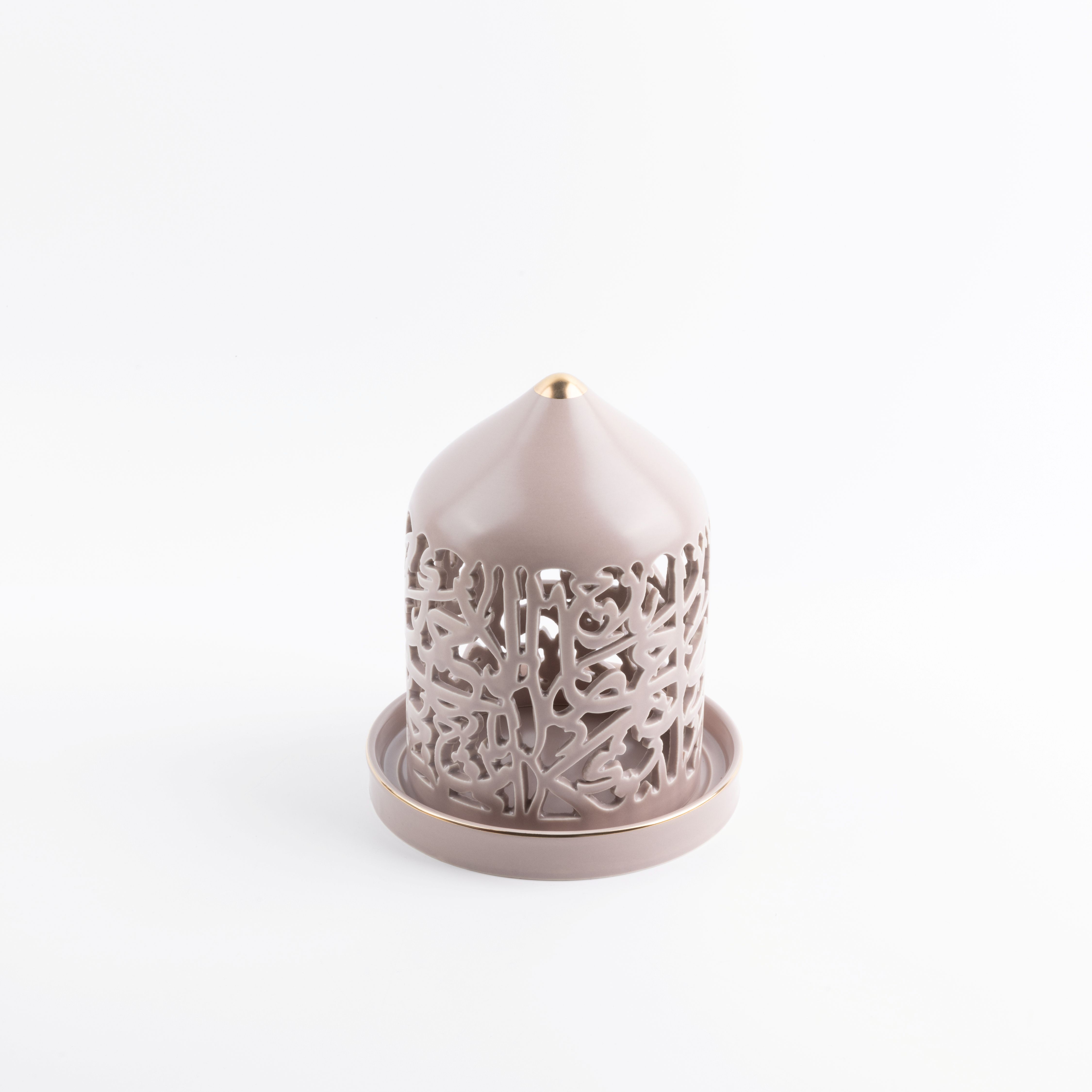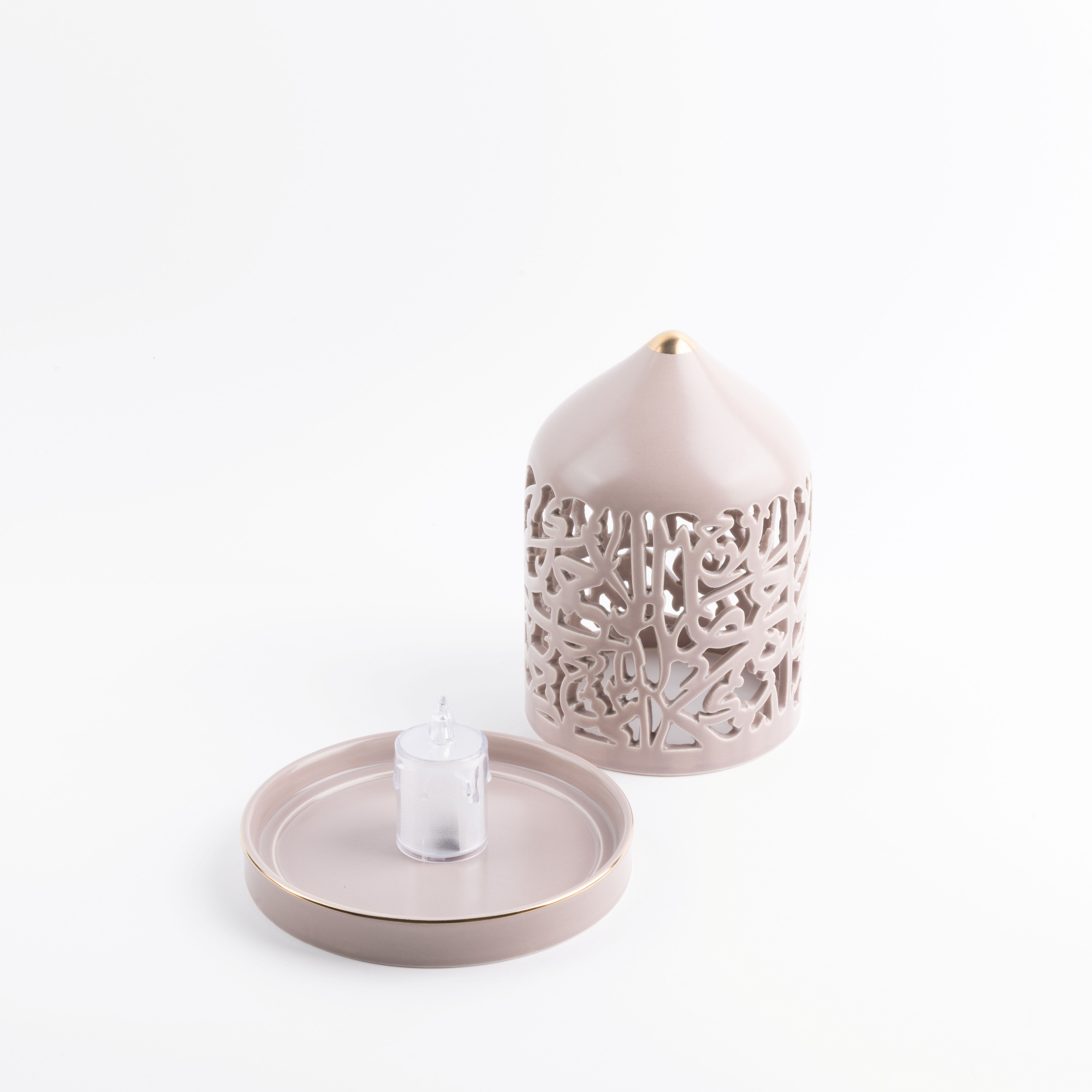 - The candle holder is made from porcelain, giving it an elegant appearance that harmonizes with various decors. It is decorated with Arabic calligraphy-inspired engravings with intricate details, allowing the light to spread beautifully when turned on. It comes with an elegant circular base that adds stability and protects surfaces from heat.