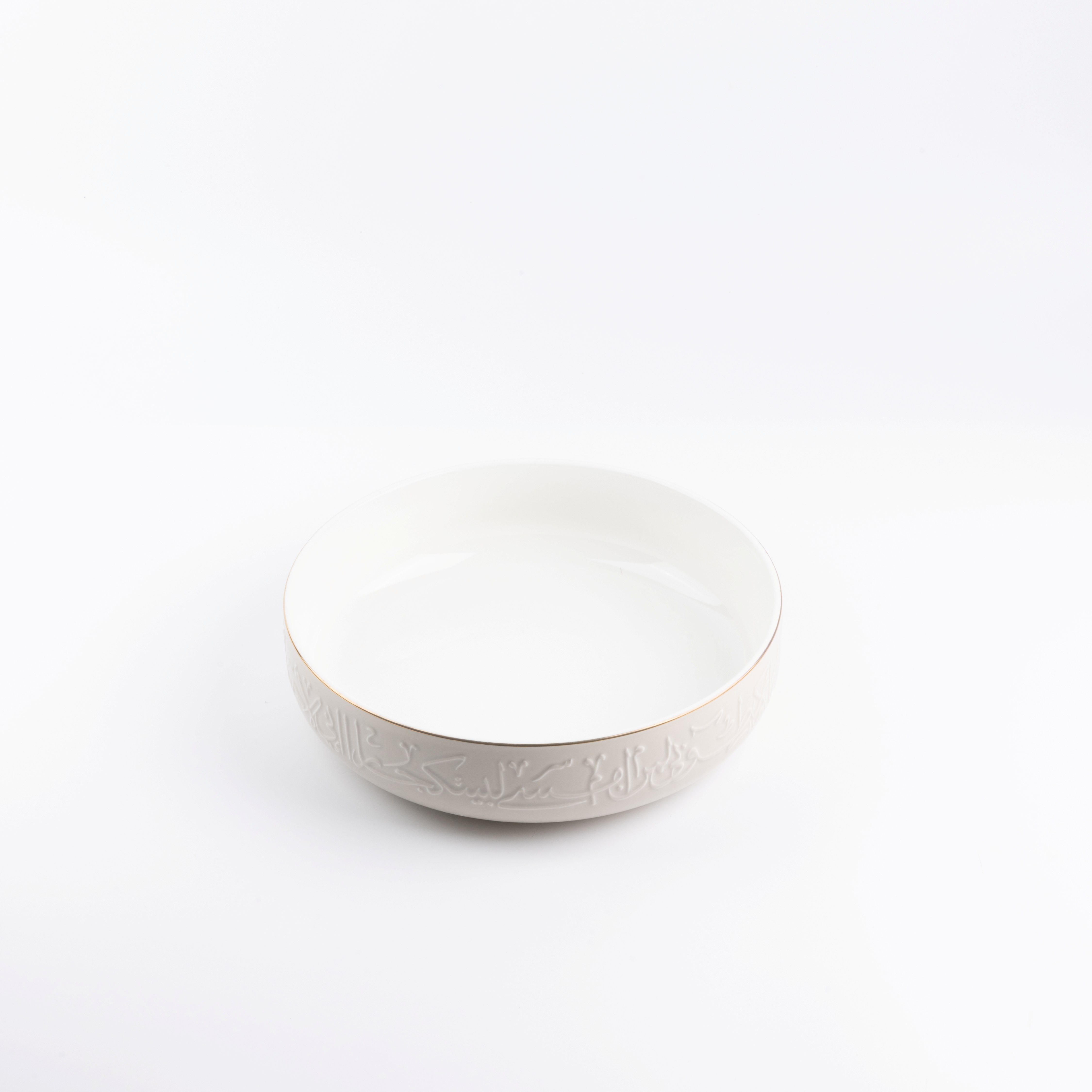A luxurious salad bowl inspired by traditional Arabic ornamentation, giving it a sophisticated cultural touch, Crafted from premium-quality materials, ensuring durability and elegance, Flawless finishing makes it a perfect fit for various table settings, The edges are adorned with intricate embossed patterns, adding an artistic charm to its appeal.