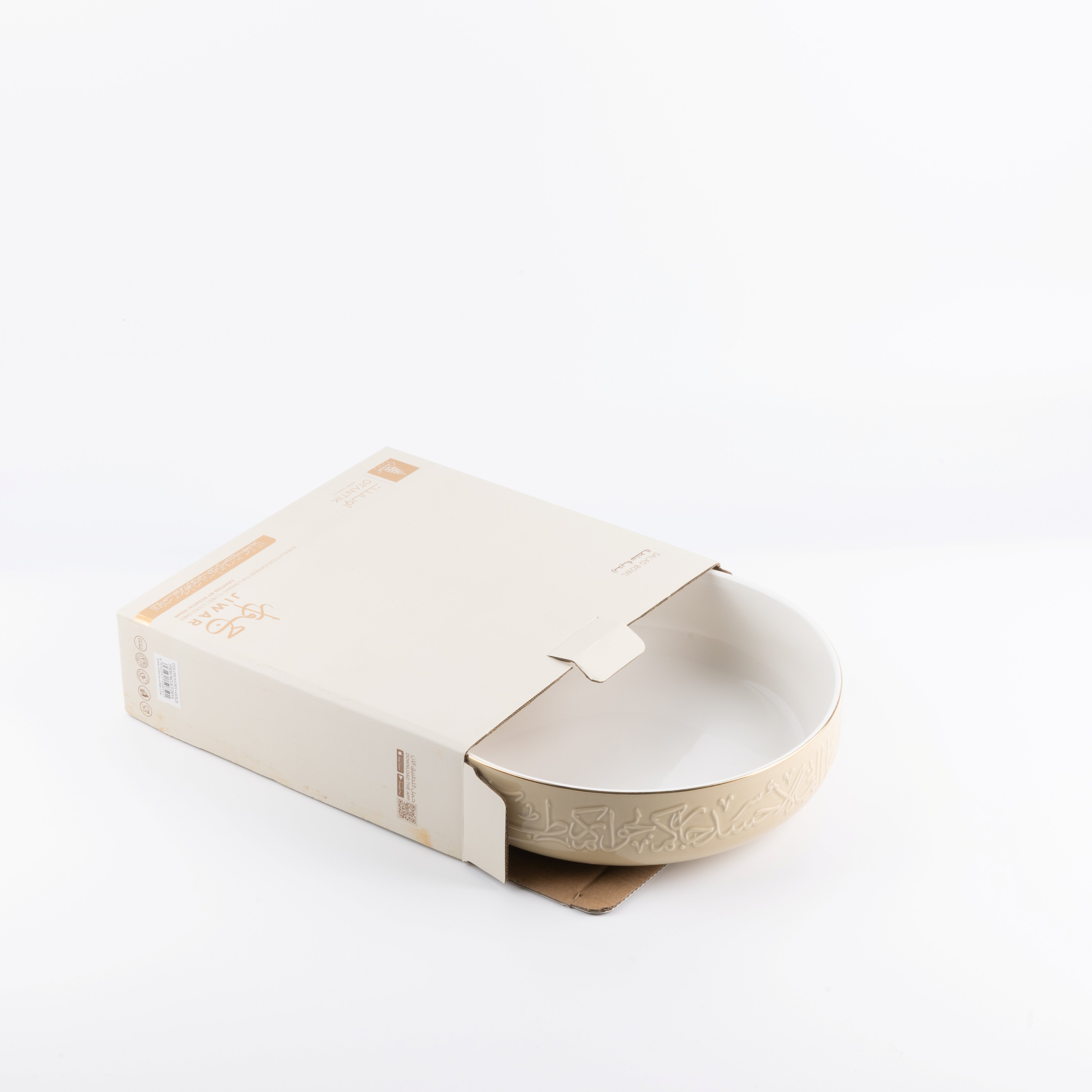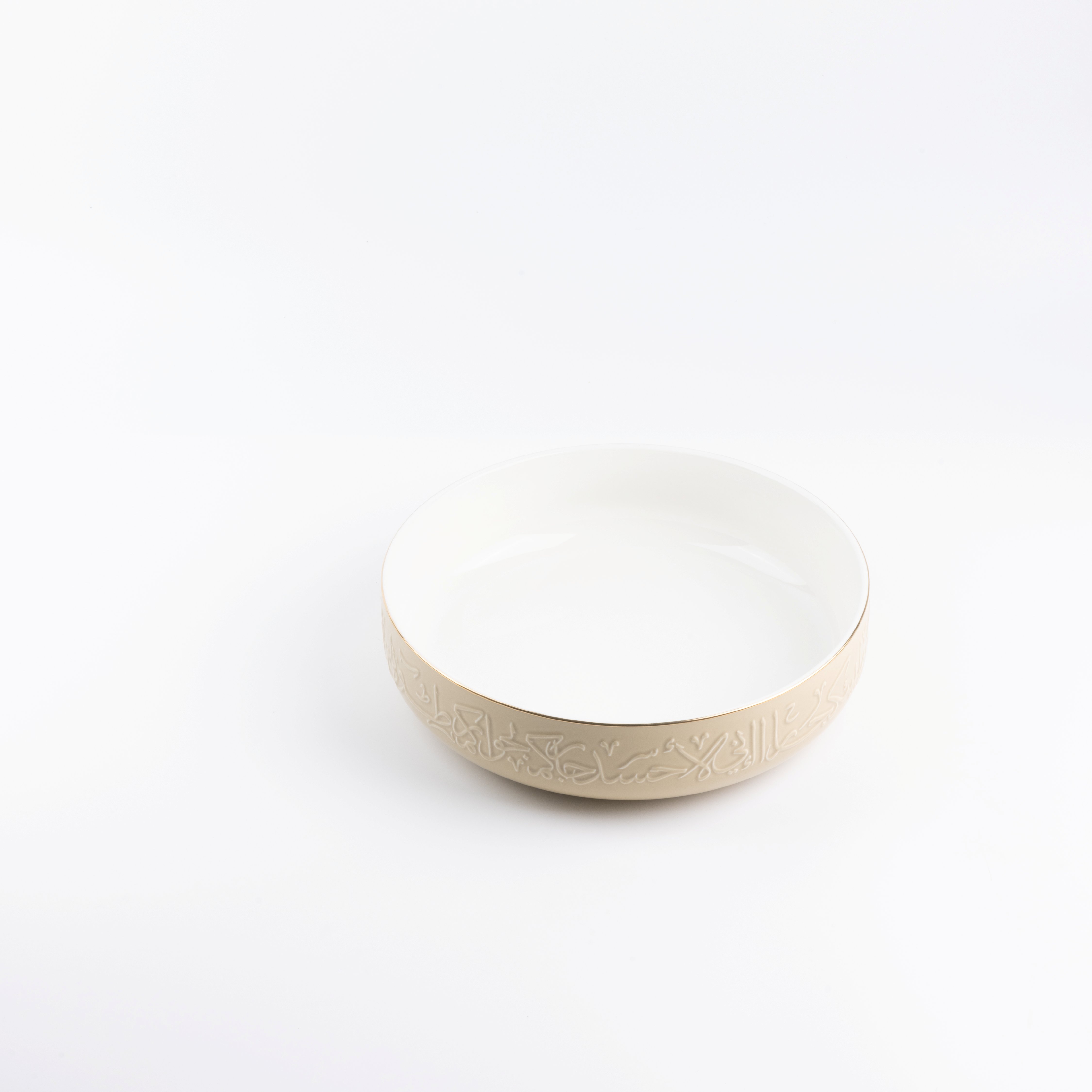 A luxurious salad bowl inspired by traditional Arabic ornamentation, giving it a sophisticated cultural touch, Crafted from premium-quality materials, ensuring durability and elegance, Flawless finishing makes it a perfect fit for various table settings, The edges are adorned with intricate embossed patterns, adding an artistic charm to its appeal.