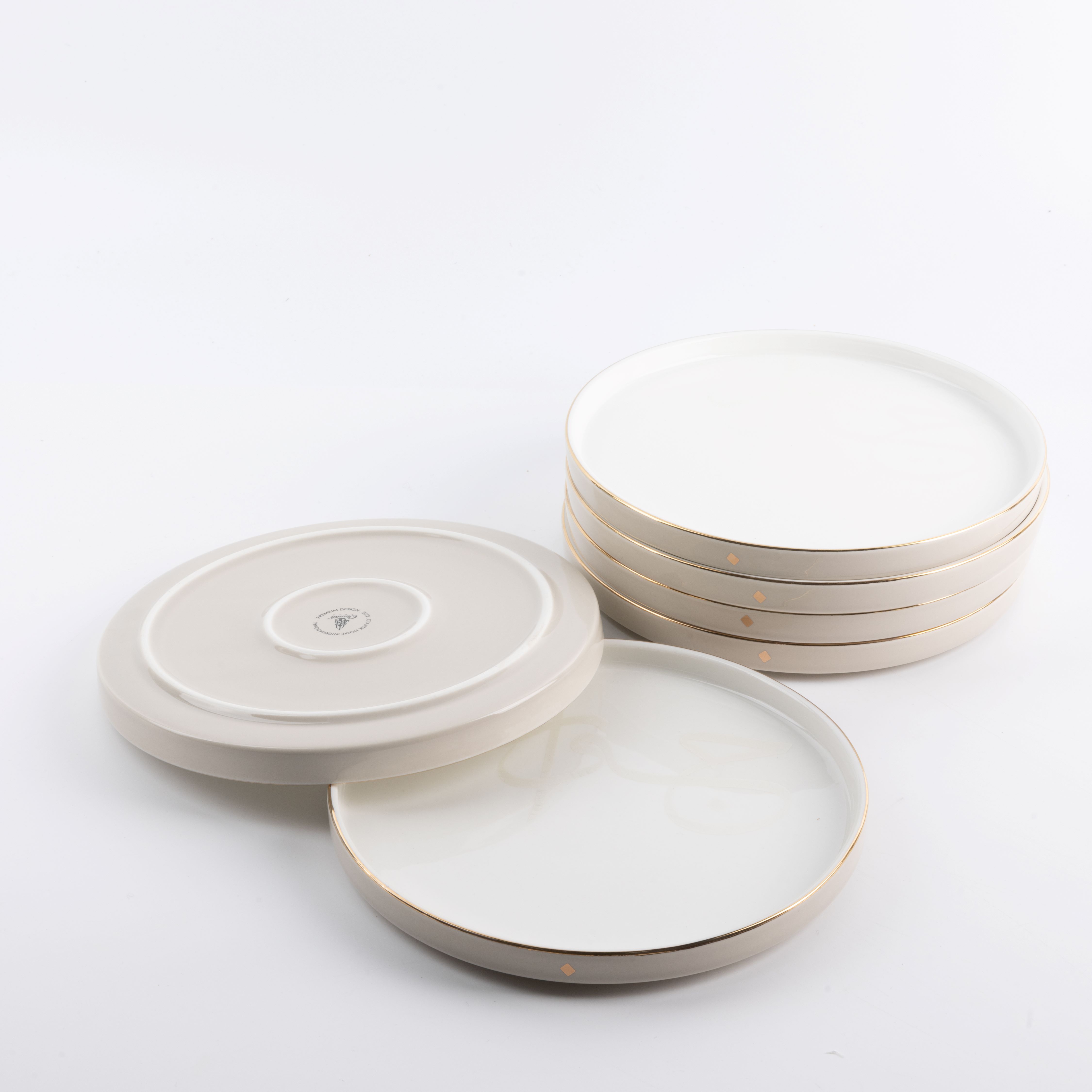 The set includes 6 large plates, perfect for serving. They are decorated with a silver-colored line along the edges of the plate. The plates have a round shape with a slight depth and slightly raised edges. Made from high-quality material, they are designed to withstand long-term use.