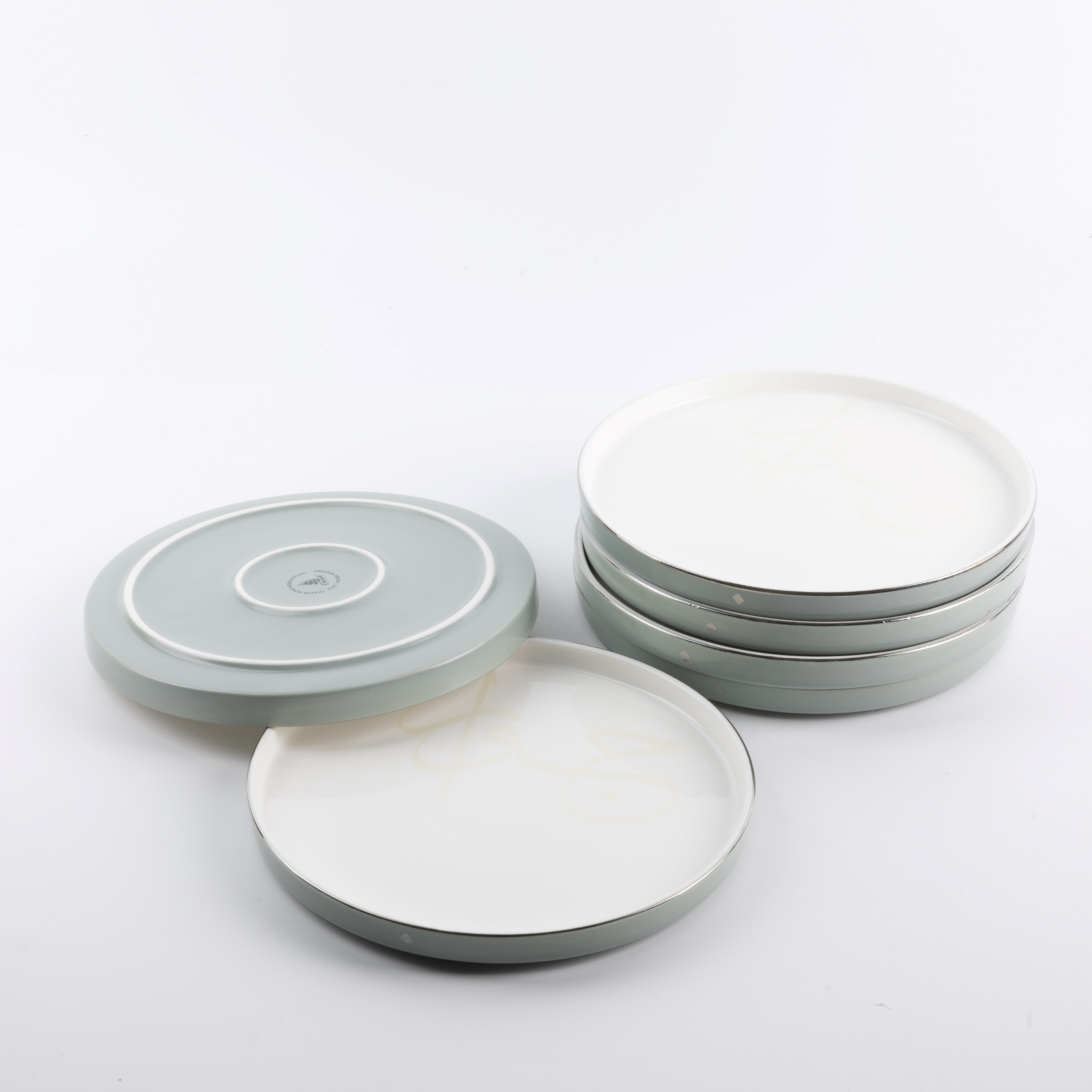 The set includes 6 large plates, perfect for serving. They are decorated with a silver-colored line along the edges of the plate. The plates have a round shape with a slight depth and slightly raised edges. Made from high-quality material, they are designed to withstand long-term use.
