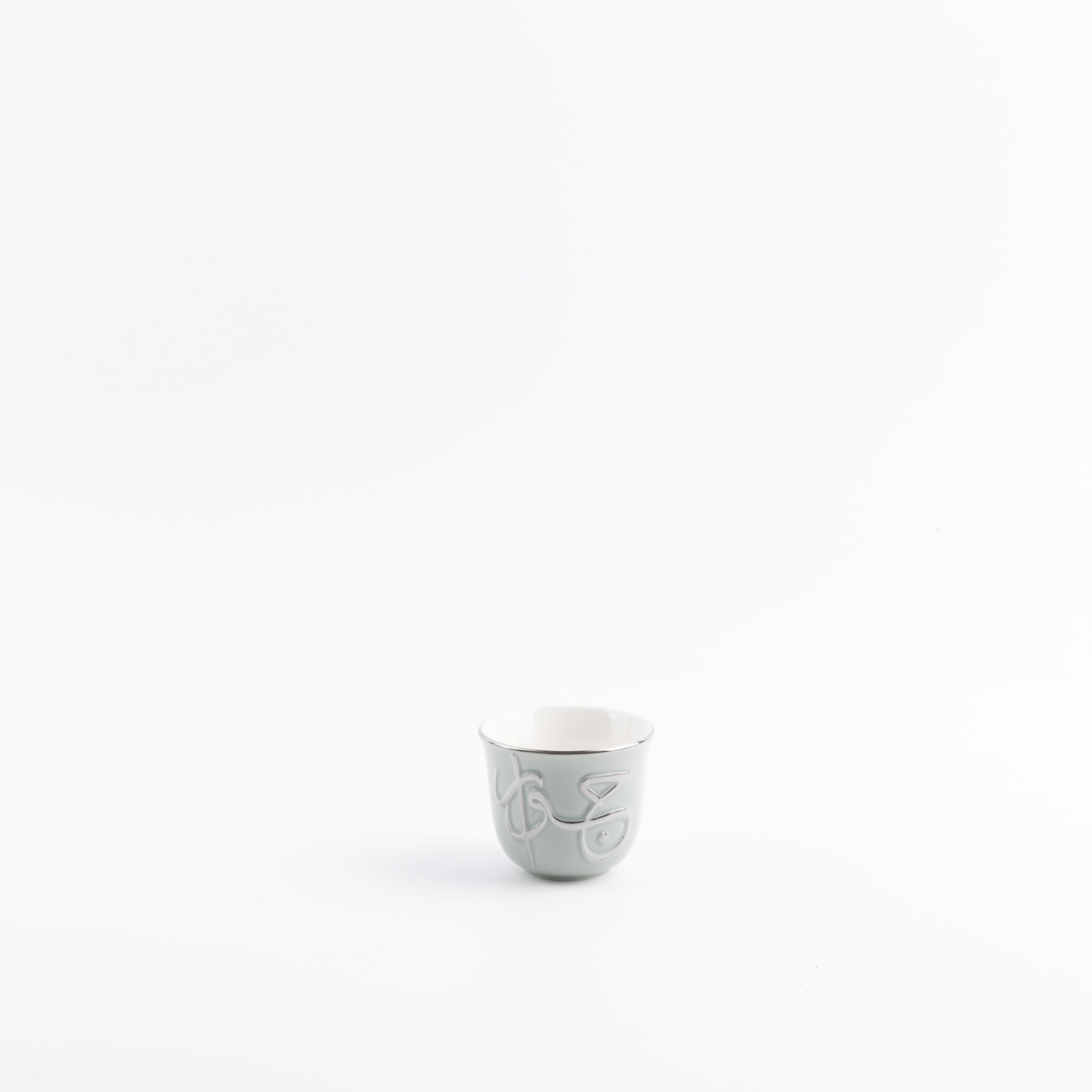 - 6 coffee cups made of porcelain, decorated with raised patterns of the word "Jiwara."
