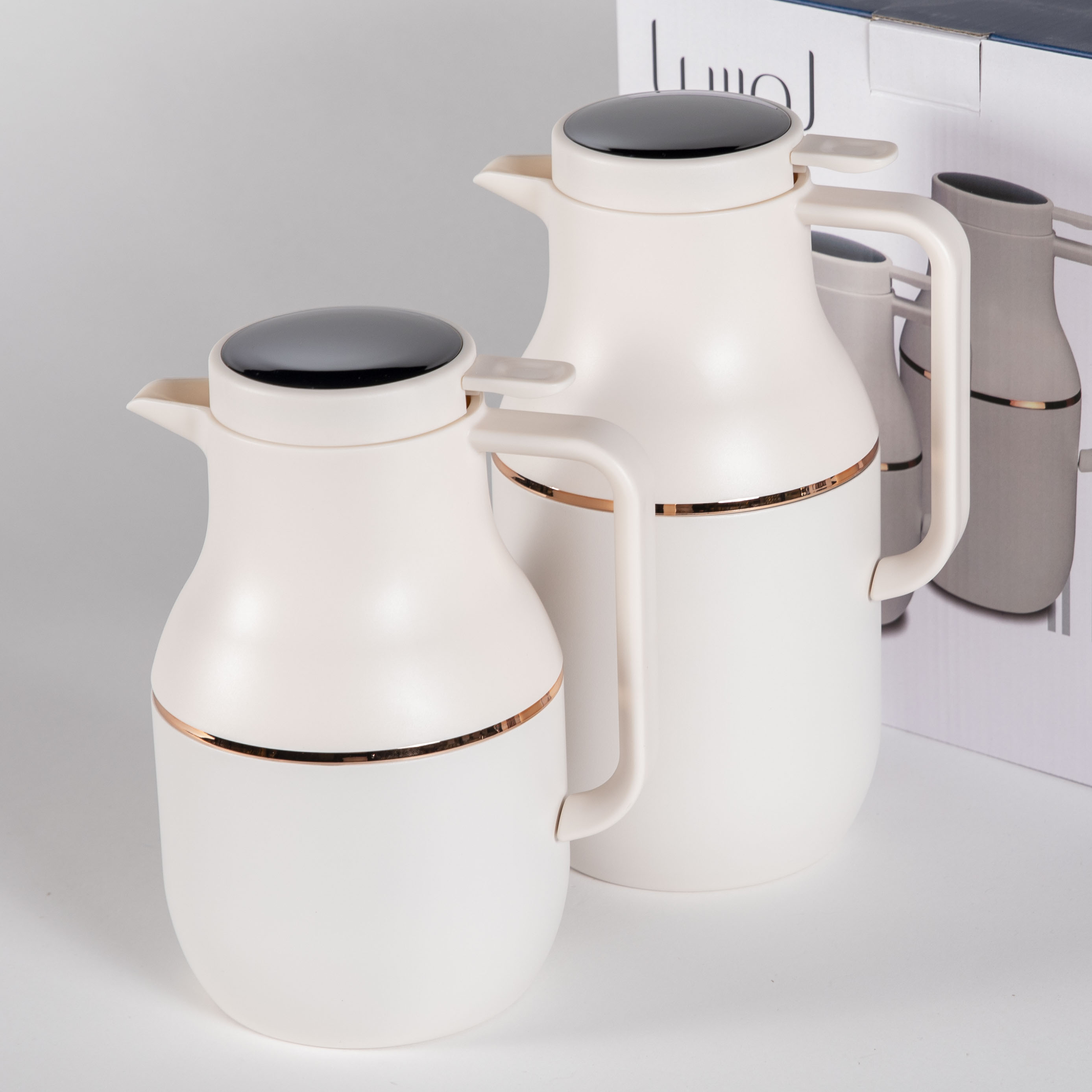 ترامس تتميز بتصميم أنيق وعصري، حيث تأتي  مع تفاصيل باللون الذهبي، مما يضفي لمسة من الفخامة. يحتوي كل ترمس على مقبض سهل الاستخدام وفوهة مصممة لتسهيل السكب. يُظهر التصميم الخارجي بساطة رائعة تناسب أي ديكور، سواء كان في المطبخ أو على الطاولة خلال المناسبات. تعتبر هذه الترامس مثالية للاحتفاظ بالمشروبات الساخنة أو الباردة لفترات طويلة.